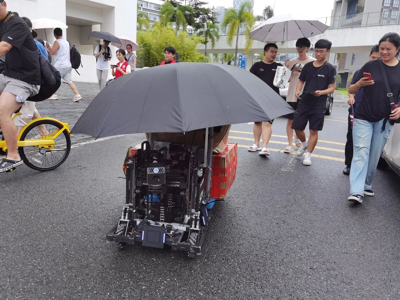 在智慧化迎新方面,深大还推出了“科技与狠活儿”。在粤海校区南区,只见一个造型硬朗的机器人拖着行李舱、“手”持小旗帜,正将新生的部分行李运往宿舍,下雨的时候它甚至还能“撑伞”防止行李淋湿。2020级机电与控制工程学院同学介绍,这是乐竞平台RobotPilots机器人实验室创新研发的工程机器人,是深大人自主设计、自主研发的成果,今年8月在全国大学生机器人大赛机甲大师超级对抗赛中进入全国八强。袁嘉恒说,该工程机器人能够负荷70kg左右的重量,能在迎新工作中帮大家节省人力。