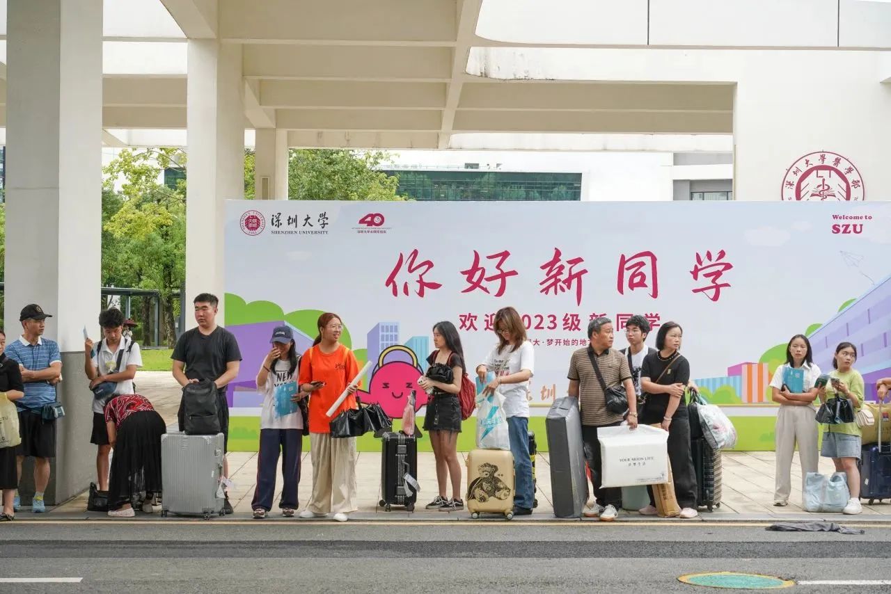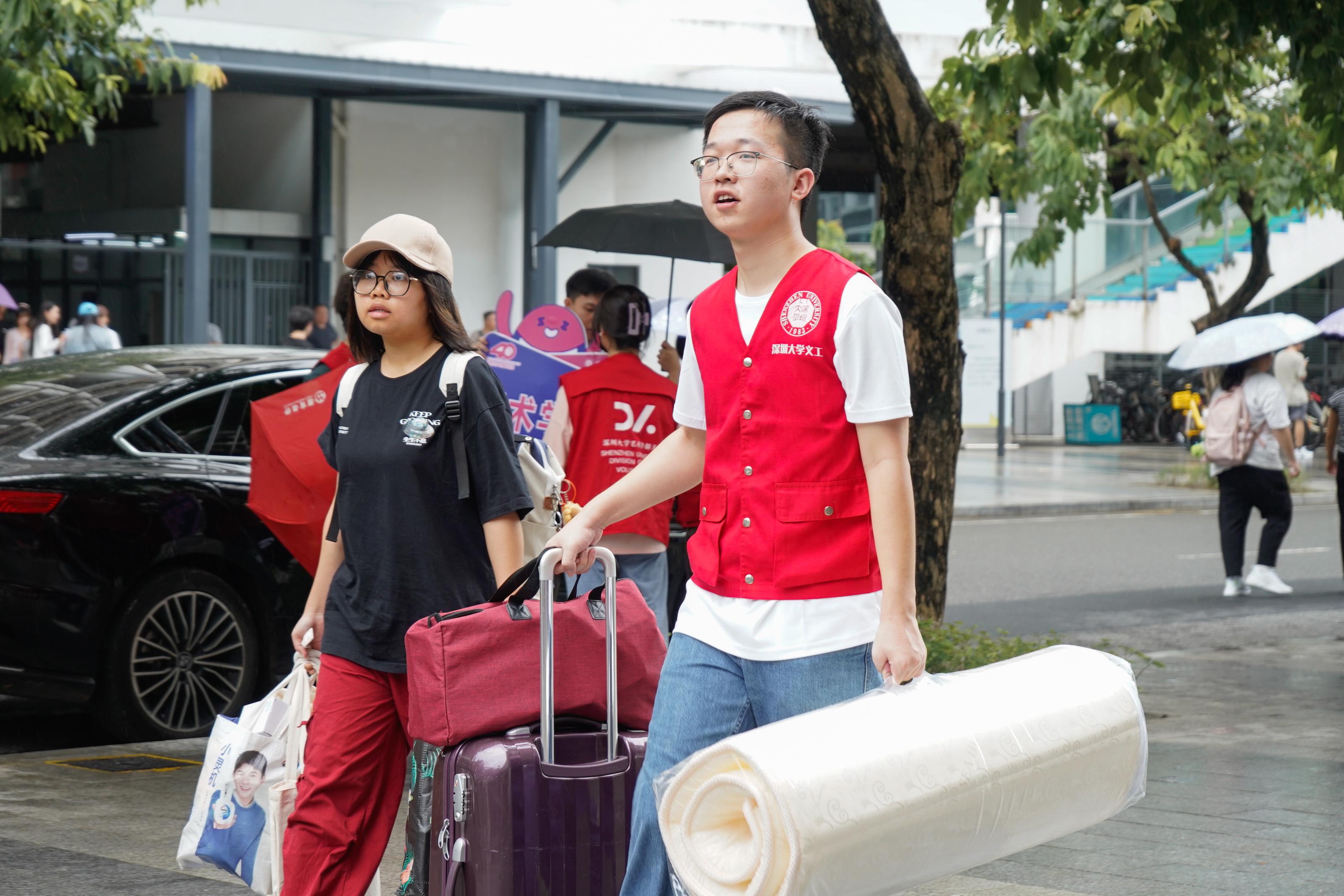 在丽湖校区,副校长李永华一行前往宿舍楼的新生报到区慰问,了解学生居住情况,听取大家对宿舍环境的需求和建议。正义广场上,“爱上深大”的巨大海报和“这一站,乐竞平台”的雕塑引来许多新生拍照打卡。