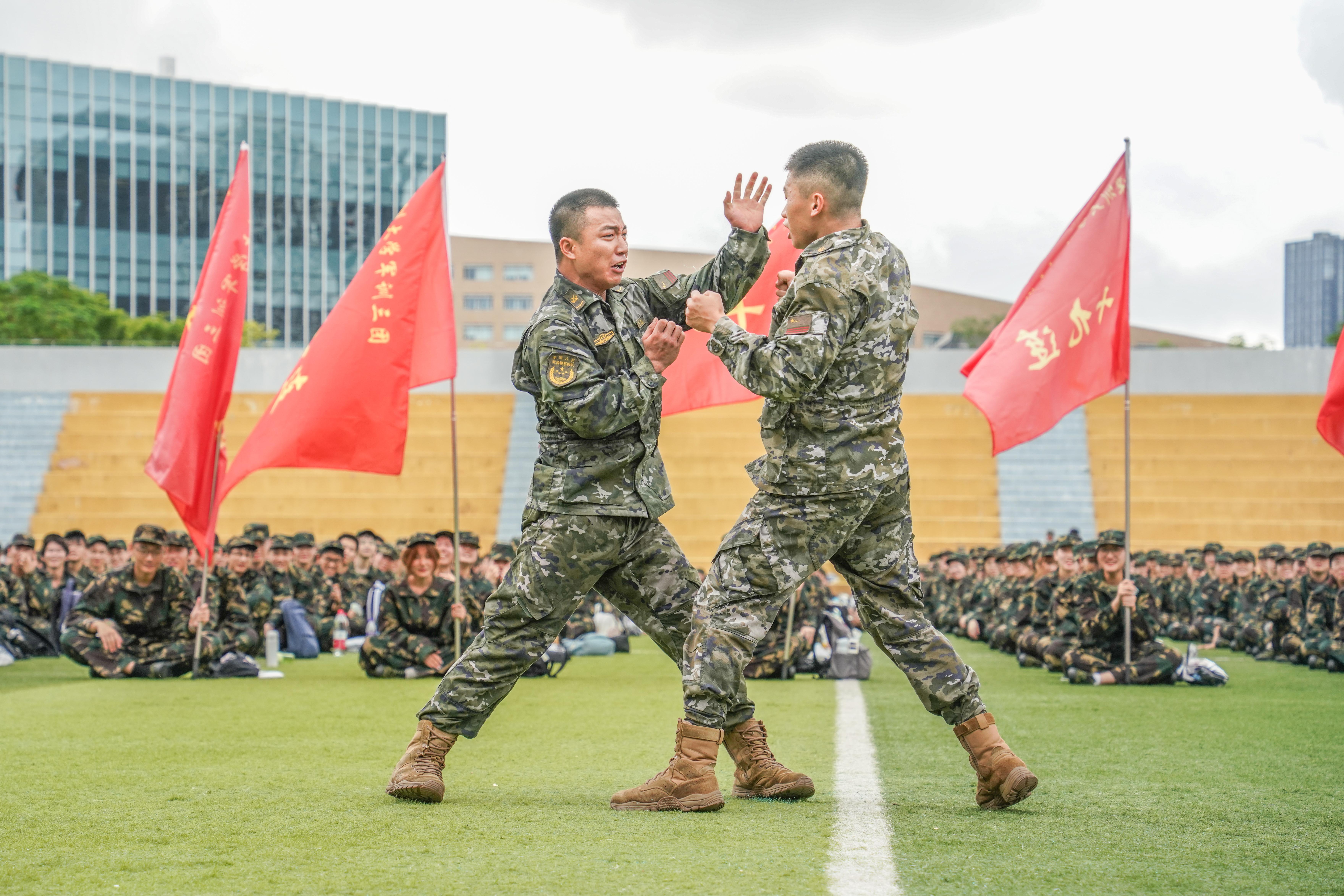 会上,两校区还分别举行授军训团旗仪式。承训教官进行基础对接动作、拳术和战术等军事科目展示。