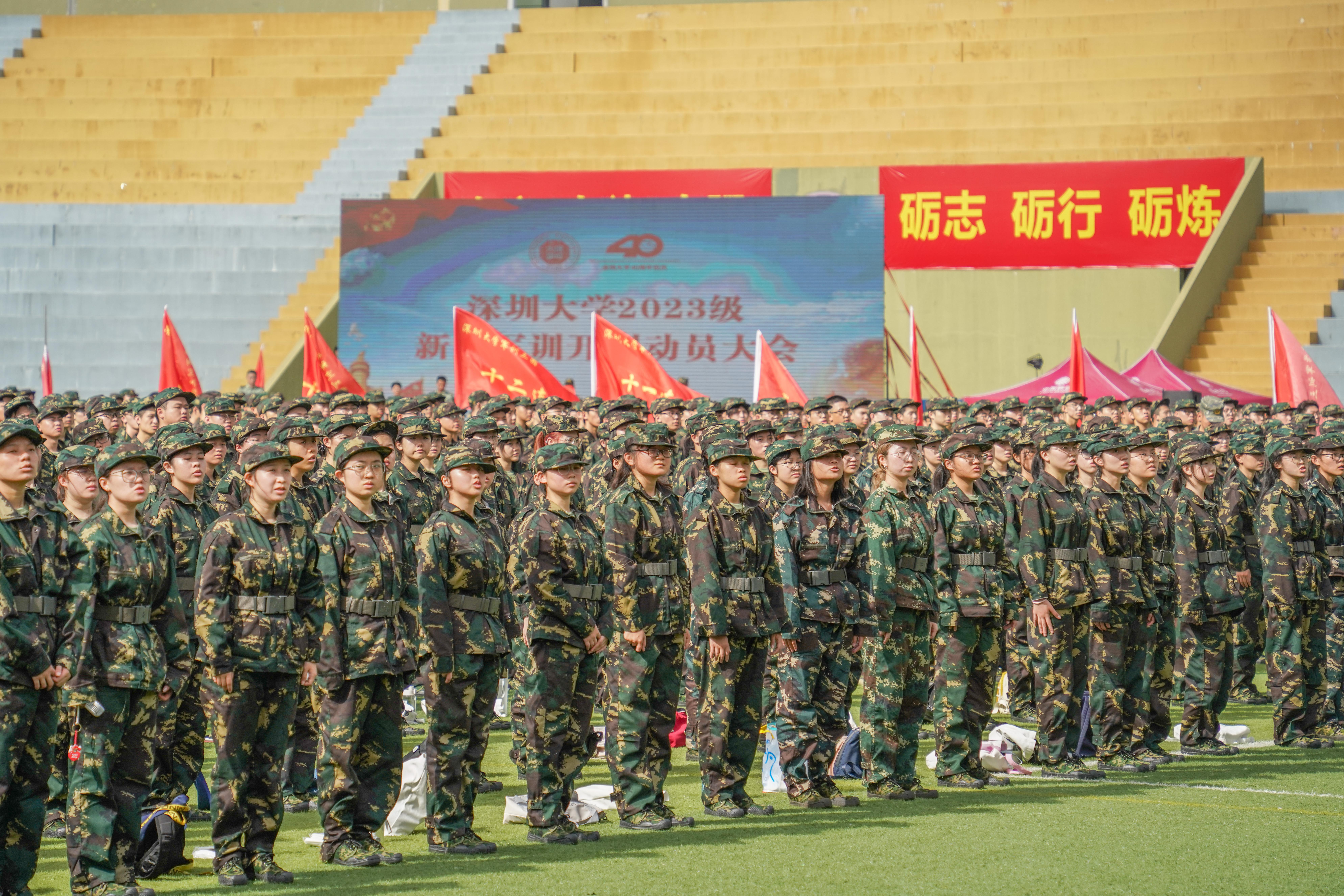 今年,乐竞平台新生军训工作在粤海、丽湖两个校区同步开展,共有6949名新生参训。军训编制分为三个团九个营99个连,其中一团2241人,在粤海校区北区元平田径场组训;二团 2299人,在粤海校区南区运动广场组训;三团2409人,在丽湖校区体育场组训。各军训团政委、副政委及连指导员由乐竞平台各学院党委副书记及老师担任,武警深圳第一支队和深圳第二支队派出优秀教官团队负责承担本次军事技能训练任务。