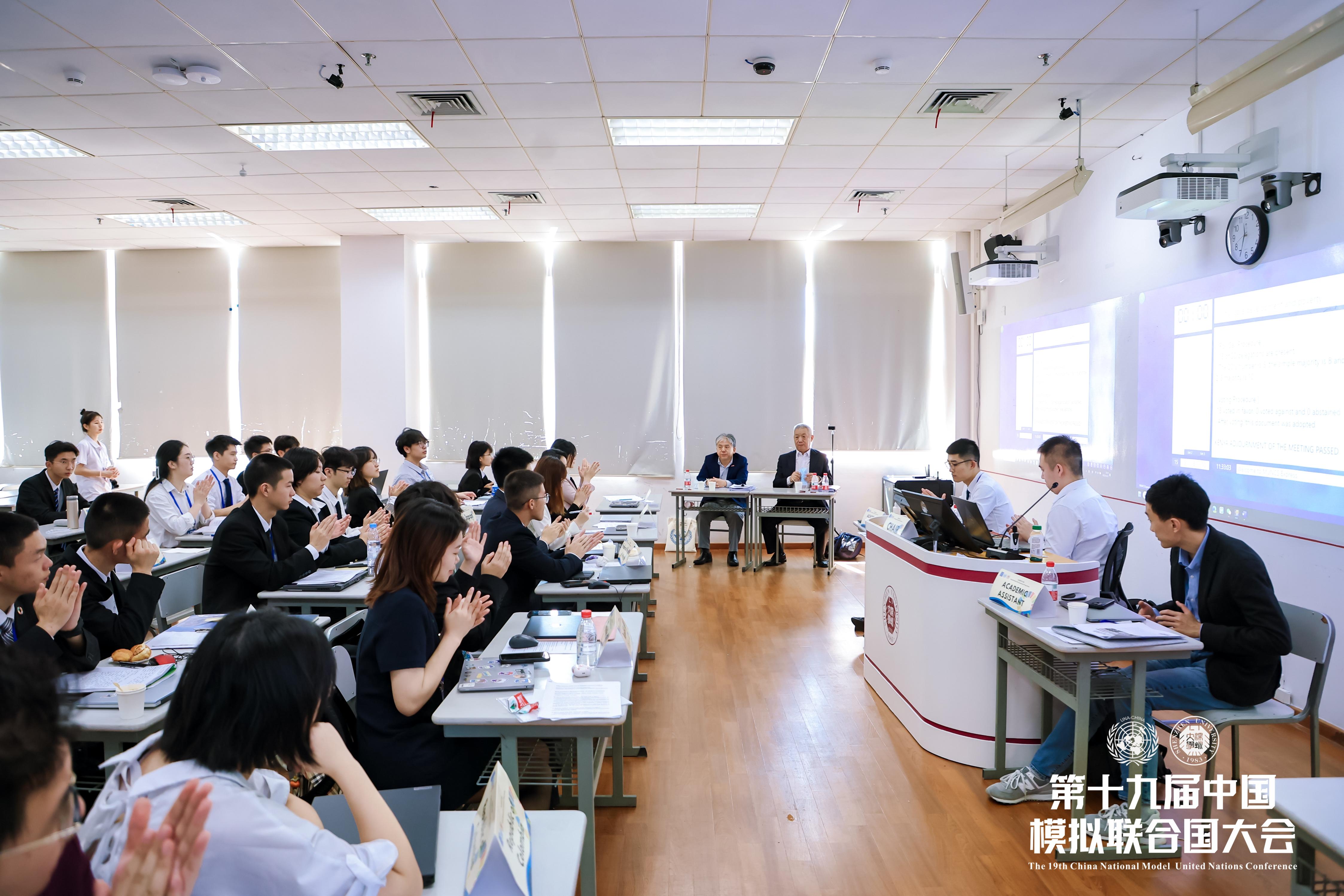 在三天的会期中,来自74所高校的近300名学生代表分别在联合国大会第一委员会、联合国大会第三委员会、联合国开发计划署、联合国粮食及农业组织、国际民航组织、联合国气候变化大会、主新闻中心七个会场,模拟各国外交官,就政治安全、文化、农业、气候、航空等发展议题展开辩论、磋商等共4轮会议。会议现场座无虚席,代表们的桌子上摆放着文件、电脑和所代表国家的桌牌,“外交官们”有条不紊地进行发言前准备。
