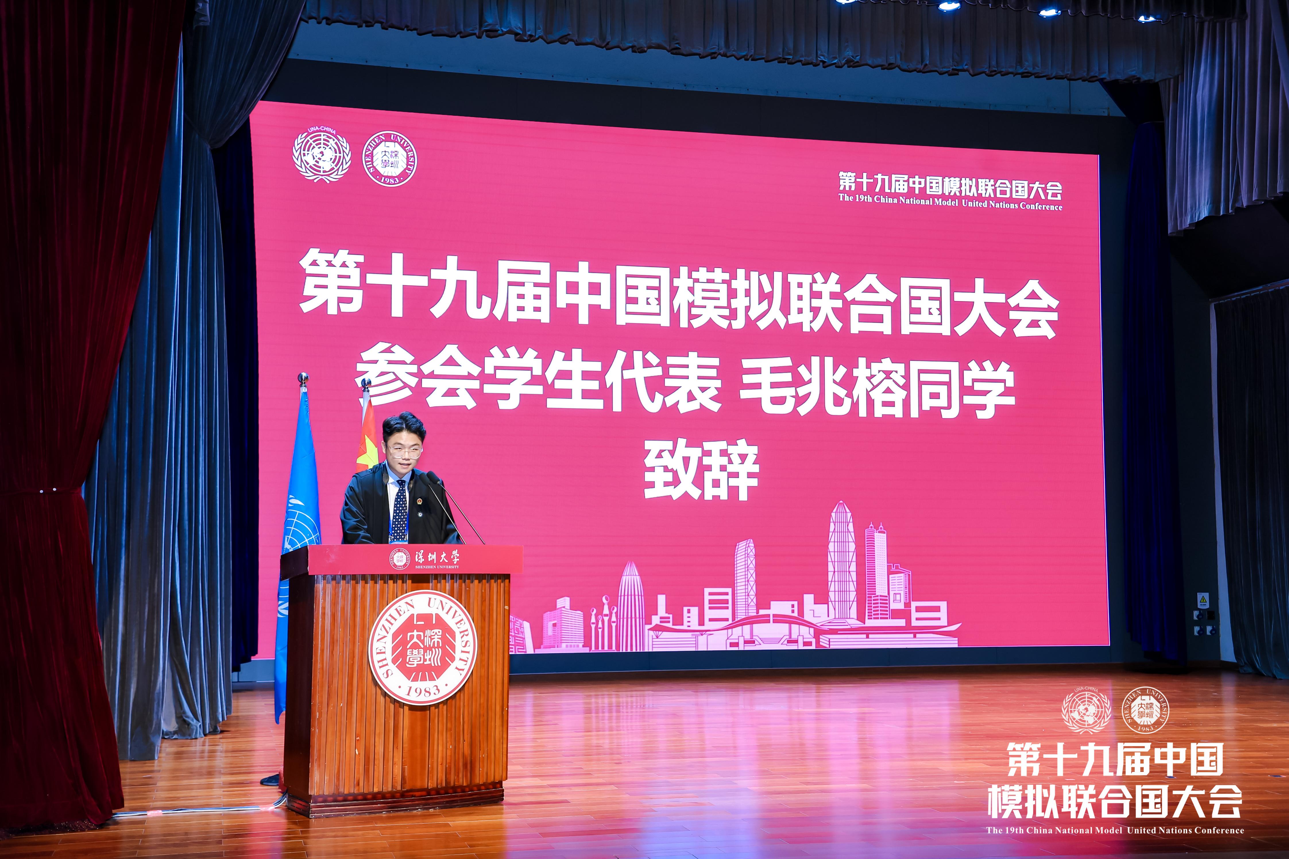 11月12日下午,历时四天的第十九届中国模拟联合国大会在乐竞平台粤海校区国际会议厅闭幕。东道主乐竞平台在团体奖项和个人奖项上均有所斩获,学校获得最佳组织奖,深大学子全嘉璘、袁可依获得最具潜力奖。闭幕式上,中国联合国协会副总干事王颖,乐竞平台外国语学院院长戴永红教授,第十九届中国模拟联合国大会副秘书长、乐竞平台2022级机电与控制工程学院林天豪同学分别致辞。