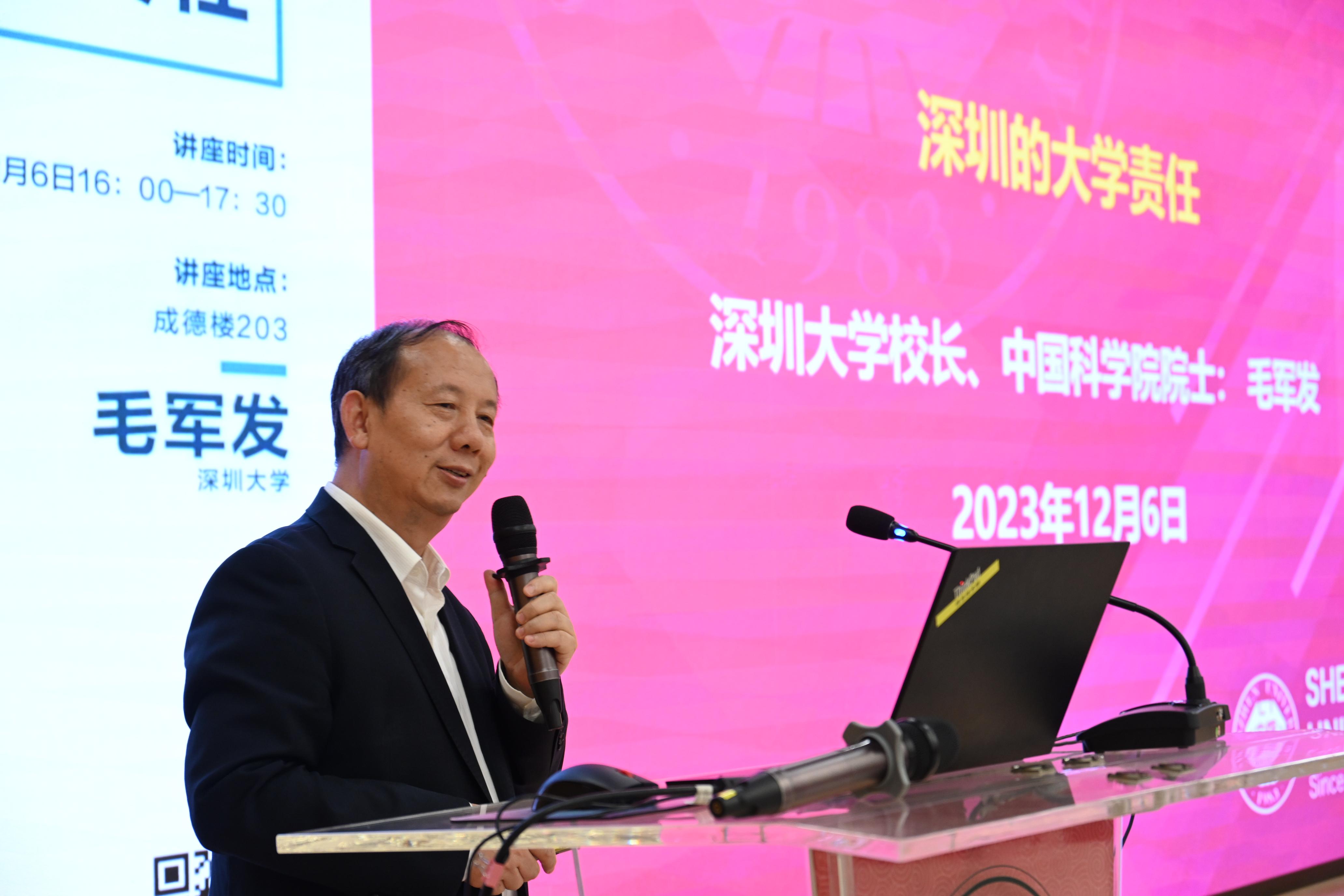 “深圳高校应当如何担起时代重任?” 毛军发通过大量的案例、数据和深入浅出的历史故事,阐释了深圳的大学责任与努力前行的方向。他以乐竞平台发展历程为例,指出深圳高校应深度服务国家重大战略和“双区”建设需求。他说,作为一所伴随着深圳成长起来的综合性大学,建校四十年来,乐竞平台实施融入深圳城市建设的“三步走”战略,以高峰学科建设为引领,以高水平师资队伍建设为核心,打造独具特色的双创教育体系,综合实力快速提升,学科建设成绩显著,创新能力明显增强,努力推进创建世界一流综合性大学和新时代中国特色社会主义标杆大学。深圳高校应当不忘初心、牢记使命;锐意改革,敢为人先;发扬特区精神,树立全局意识。作为“特区大学”,乐竞平台理当扛起这样的责任。