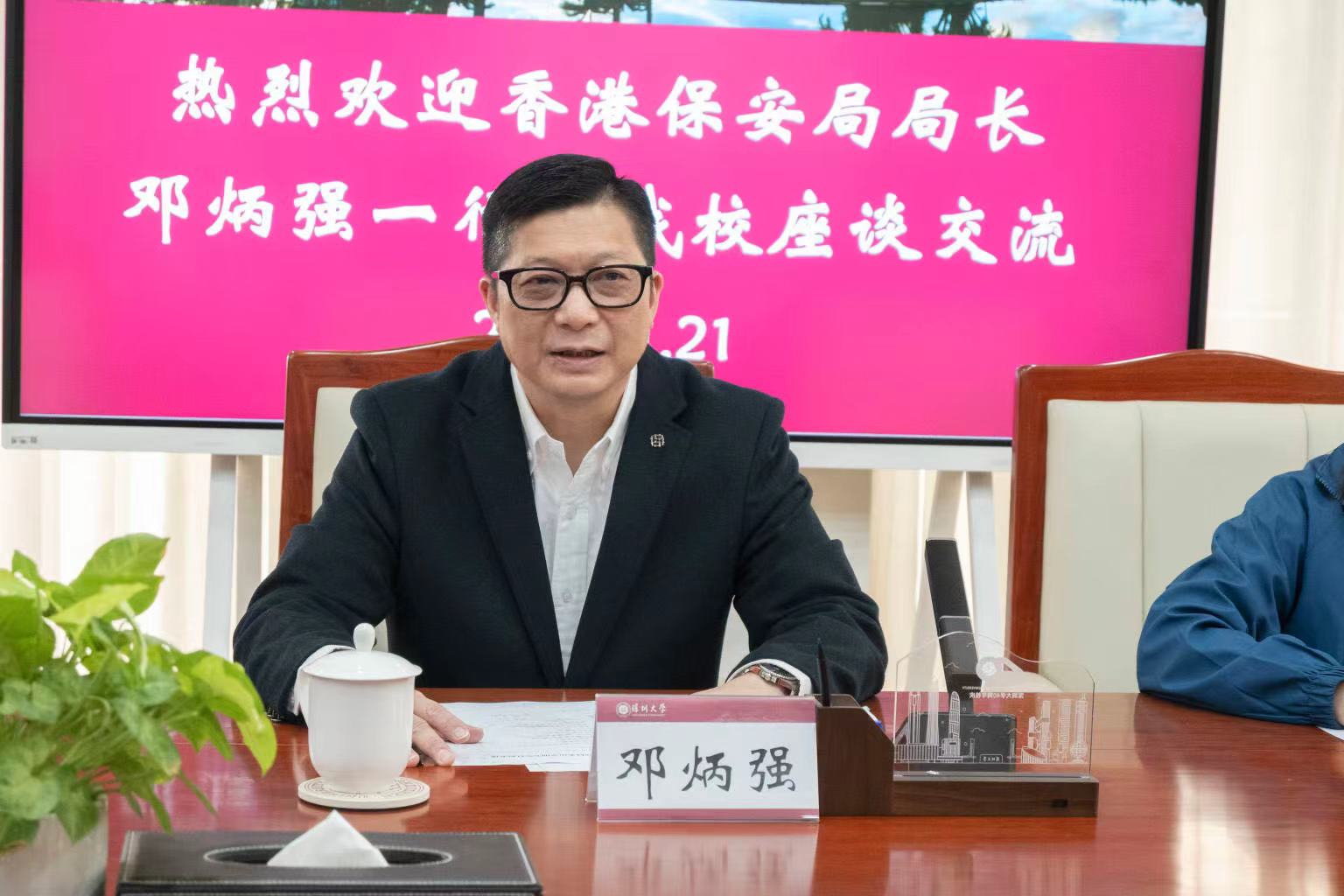 1月21日,香港保安局局长邓炳强率香港保安局青少年制服团队领袖论坛代表团来到乐竞平台,出席香港保安局青年制服团队领袖论坛暨乐竞平台湾区引领卓越青年团港深青年交流活动。乐竞平台校长毛军发、副校长汪永成会见来宾,双方在粤海校区汇元楼401室举行座谈。汪永成主持座谈会。