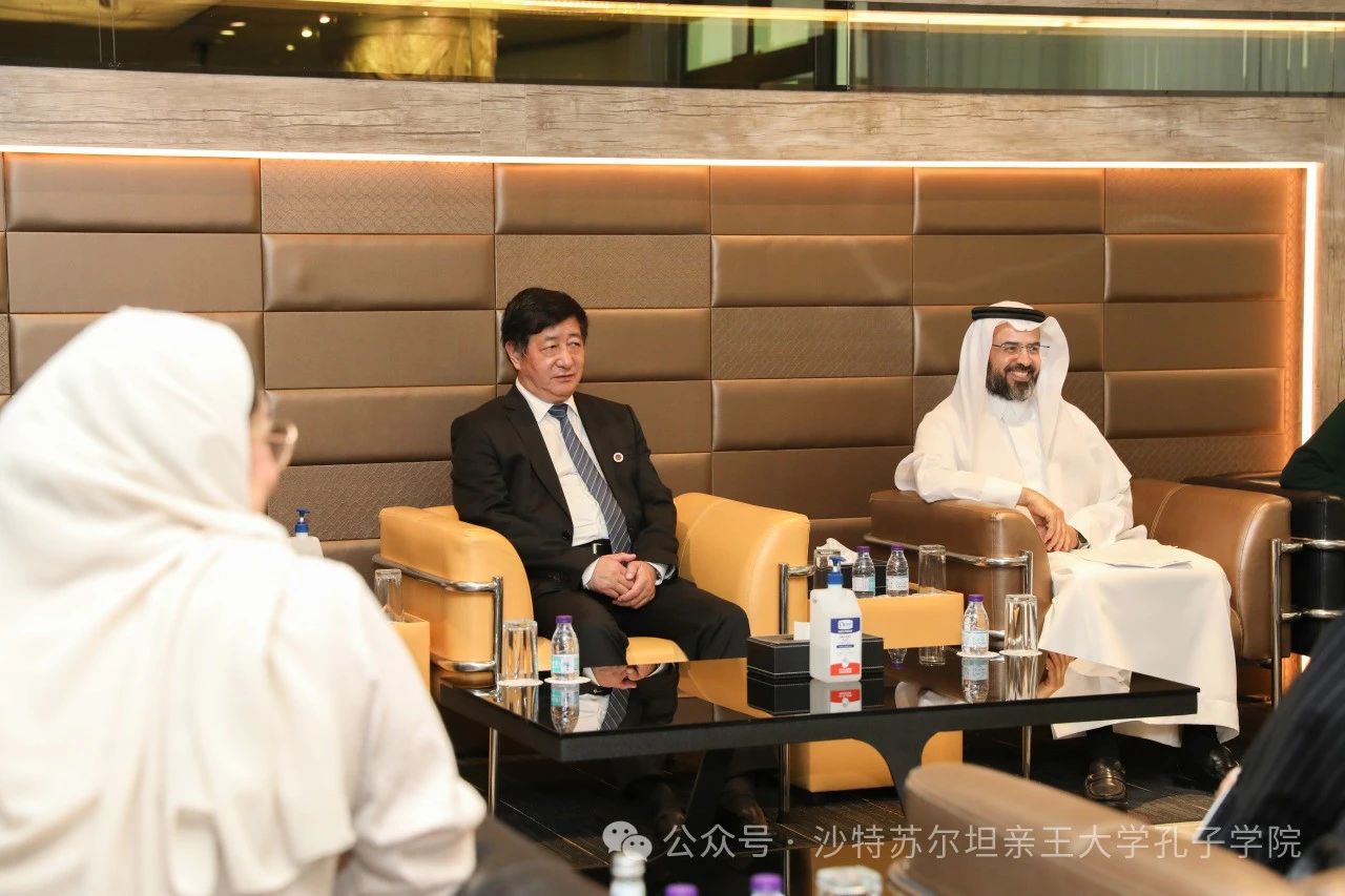 参观结束后,代表团与孔子学院师生进行亲切座谈。沙特孔院中文教师张爔详细汇报了孔院一年来在中文教育和文化推广方面取得的成绩。孔院中方院长张新颖介绍说,目前孔子学院开设的中文课程受到当地学生的热烈欢迎,已有三名学生通过了HSK2级考试。他们不仅在语言学习上取得了优异成绩,还积极参与了孔院首次组织的汉语桥春令营等文化交流活动,展现了沙特学生对中国文化的浓厚兴趣。
