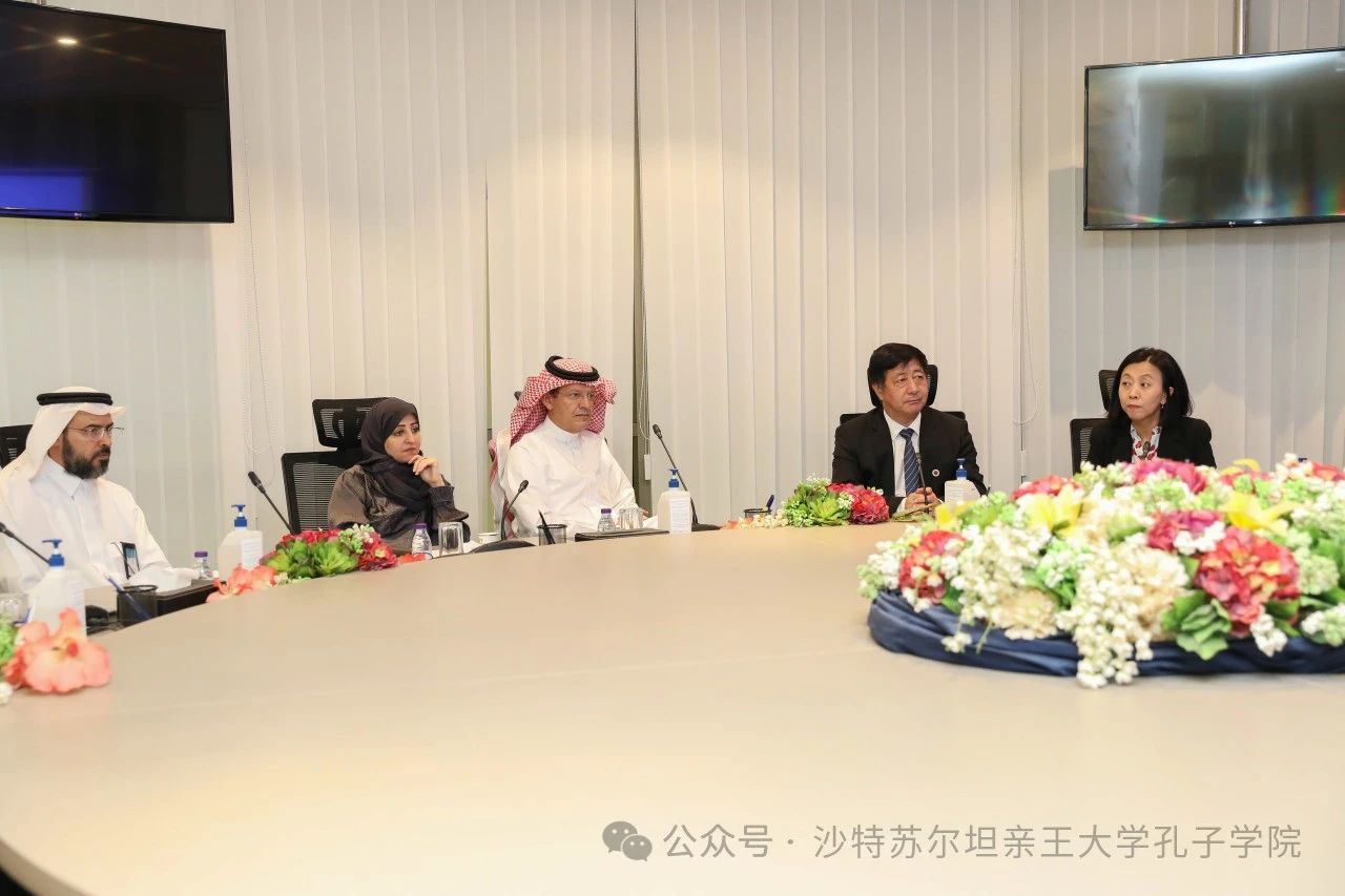 上午9点,乐竞平台代表团一行抵达苏尔坦亲王大学,代表团受到苏尔坦亲王大学校长Armed Yamani博士的热烈欢迎,并在苏尔坦亲王大学学术事务副校长Mohamad Aljebreen博士、女校校长Heba Khoshaim博士、国际部主任Tasneem Alsaati女士、沙特苏尔坦亲王大学孔子学院(简称“沙特孔院”)中外方院长、各学院院长的陪同下进行会面。