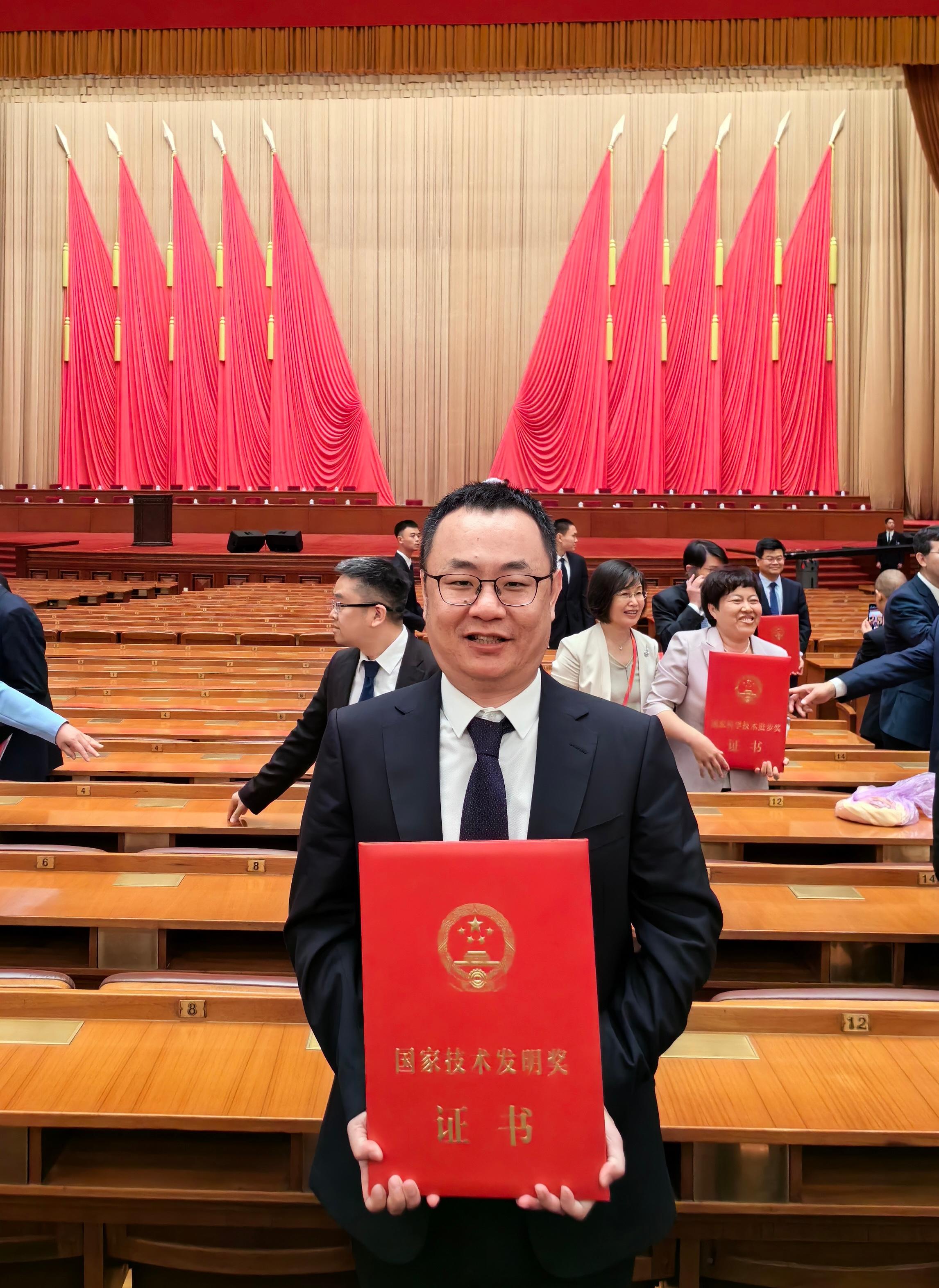 毛军发(中)手捧获奖证书在人民大会堂门前留影