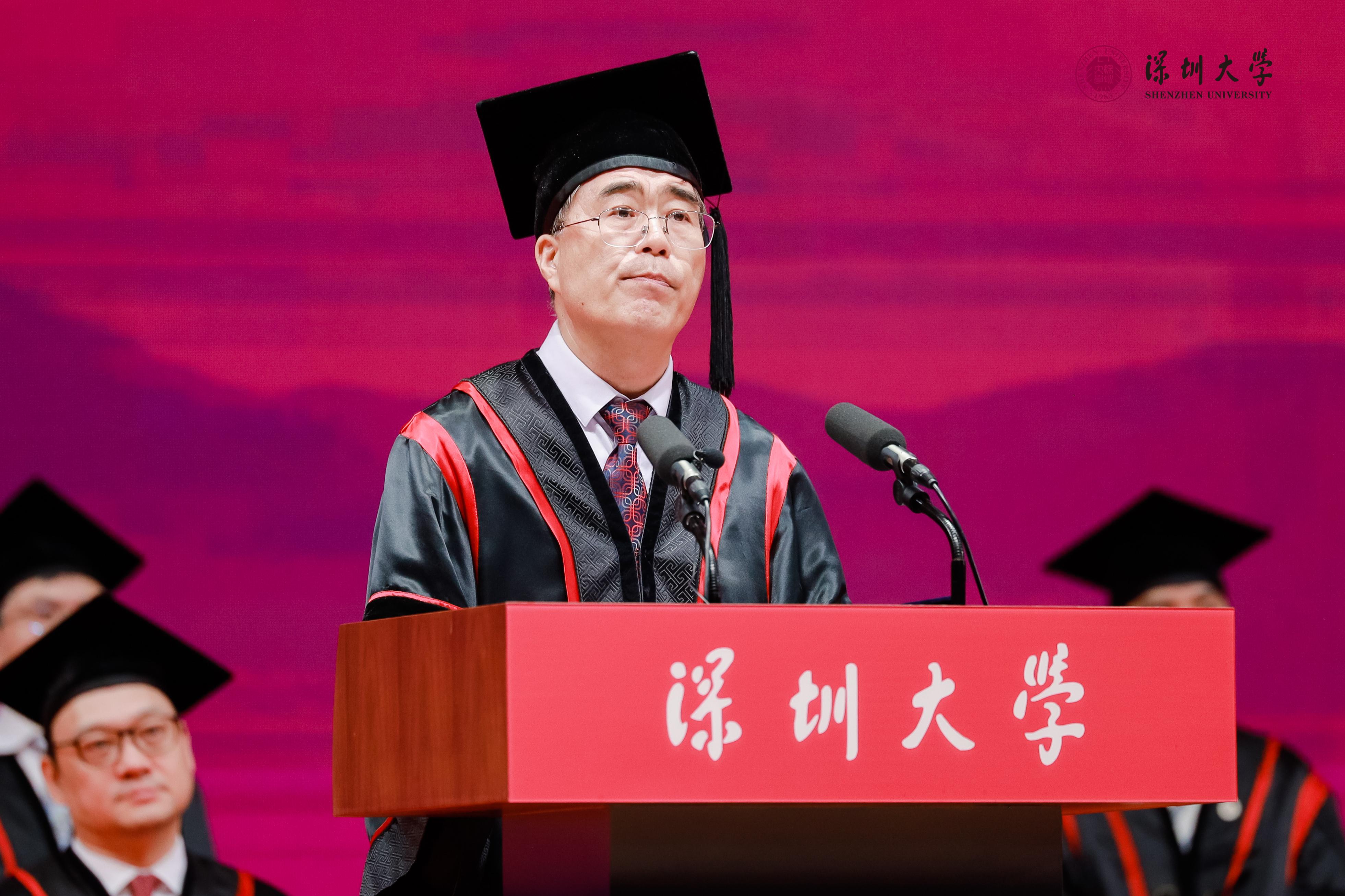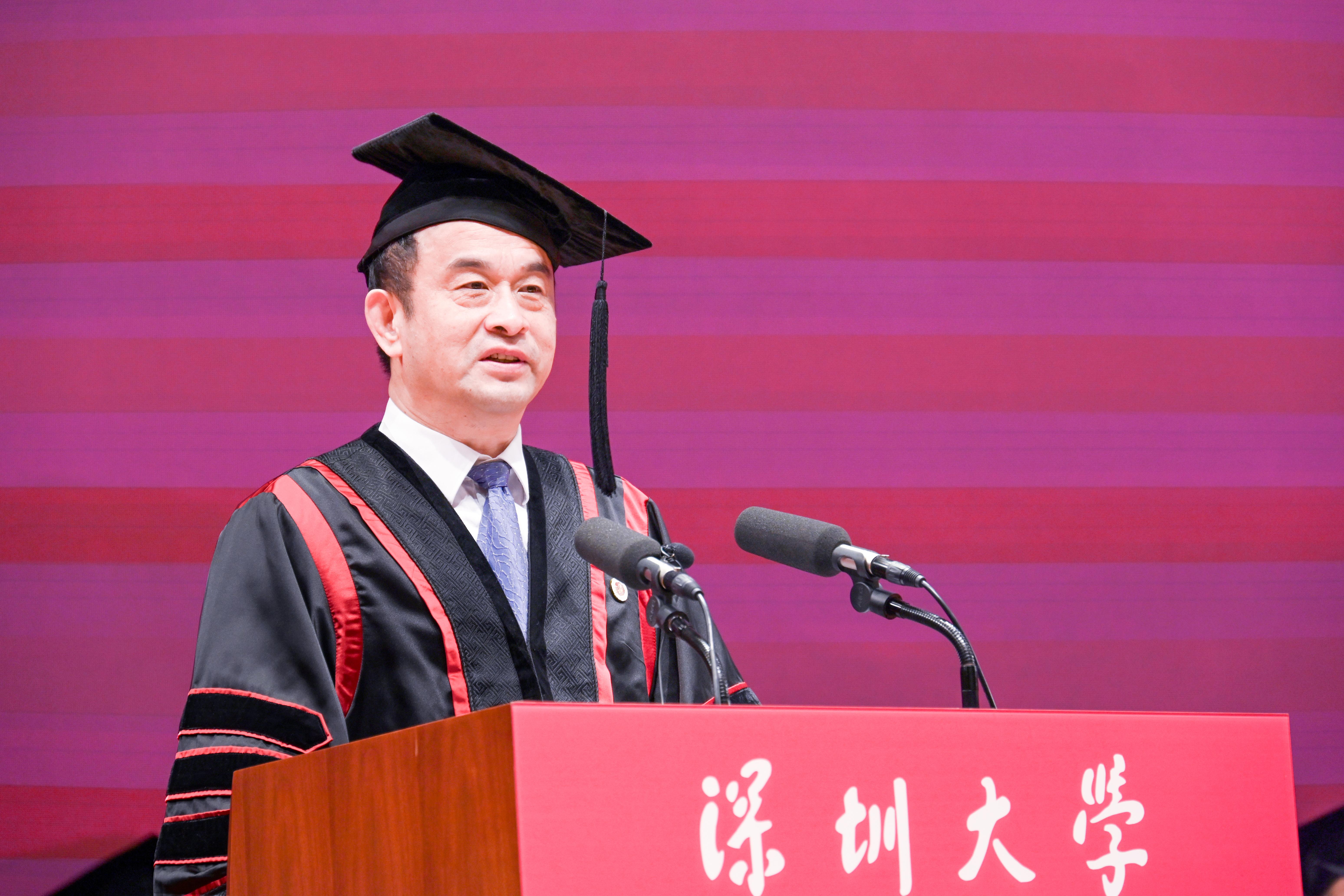在粤海校区,计算机与软件学院院长黄惠作为教师代表发言。她说,能够见证一群年轻而又充满希望的学子完成他们求知路上的一个重要里程碑,与他们共同迎接人生的新起点,是一名教师充满喜悦和骄傲的时刻。她以《勇者不惧,希望至美,热爱永恒》为题,为即将踏上新征程的毕业生带来鼓励。勇者不惧,不惧者幸福。一个人若能无惧于心,便能坦然面对生活中的风风雨雨,享受每一个当下。万物之中,希望至美。无论未来是在科学研究中遭遇瓶颈,还是在工作生活中饱受考验,只要希望不灭,就有破局的力量,人生随时可以重来。唯有热爱,可抵岁月漫长。必须要有持久的热情和不断的探索精神,怀揣对知识、对技术最深沉的热爱,才能在这不断变革的时代大潮中立于不败。