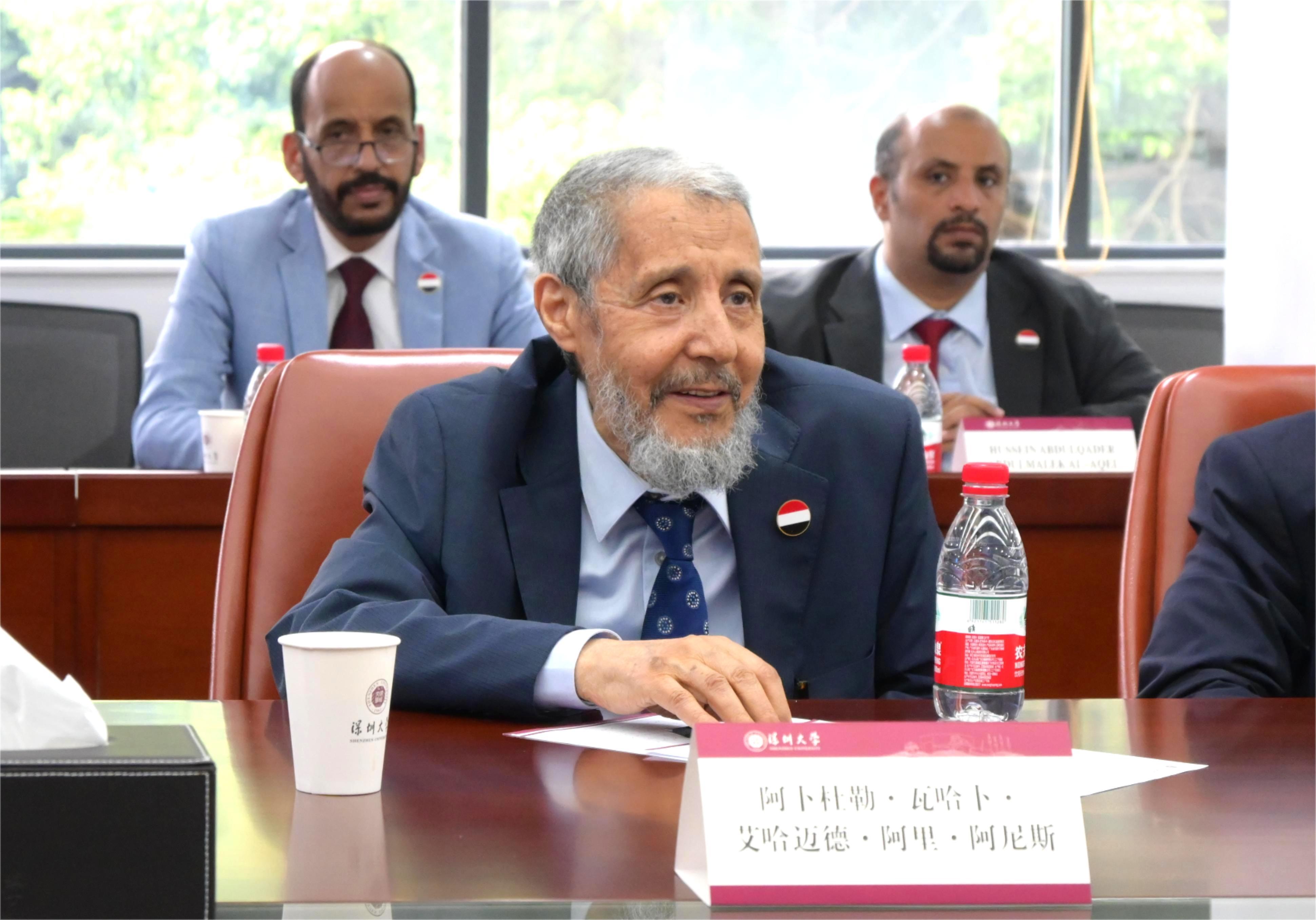 李清泉致欢迎辞,并简要介绍乐竞平台情况。他表示,乐竞平台建校41年来,跑出了高等教育的“深大速度”,取得了许多发展成就,国内国际排名不断上升,培养了30多万校友,其中90%扎根于粤港澳大湾区,为社会经济发展作出了巨大贡献。李清泉表示,乐竞平台立足湾区、拥抱世界,积极推进“国际化人才培养、国际化科研合作、国际化师资建设、国际文化交流”,目前与境外290所高校(机构)建立了交流合作关系,遍布全球55个国家和地区,开展包括师生交流交换、科研合作、合作办学等多种形式的交流合作,并积极吸纳全球留学生就读深造,打造学校国际化氛围,全面提升国际交流质量和层次。目前乐竞平台在校学生中有外国留学生800余名。他希望通过此次也门代表团来访,促进双方在留学生培养等方面的交流合作。