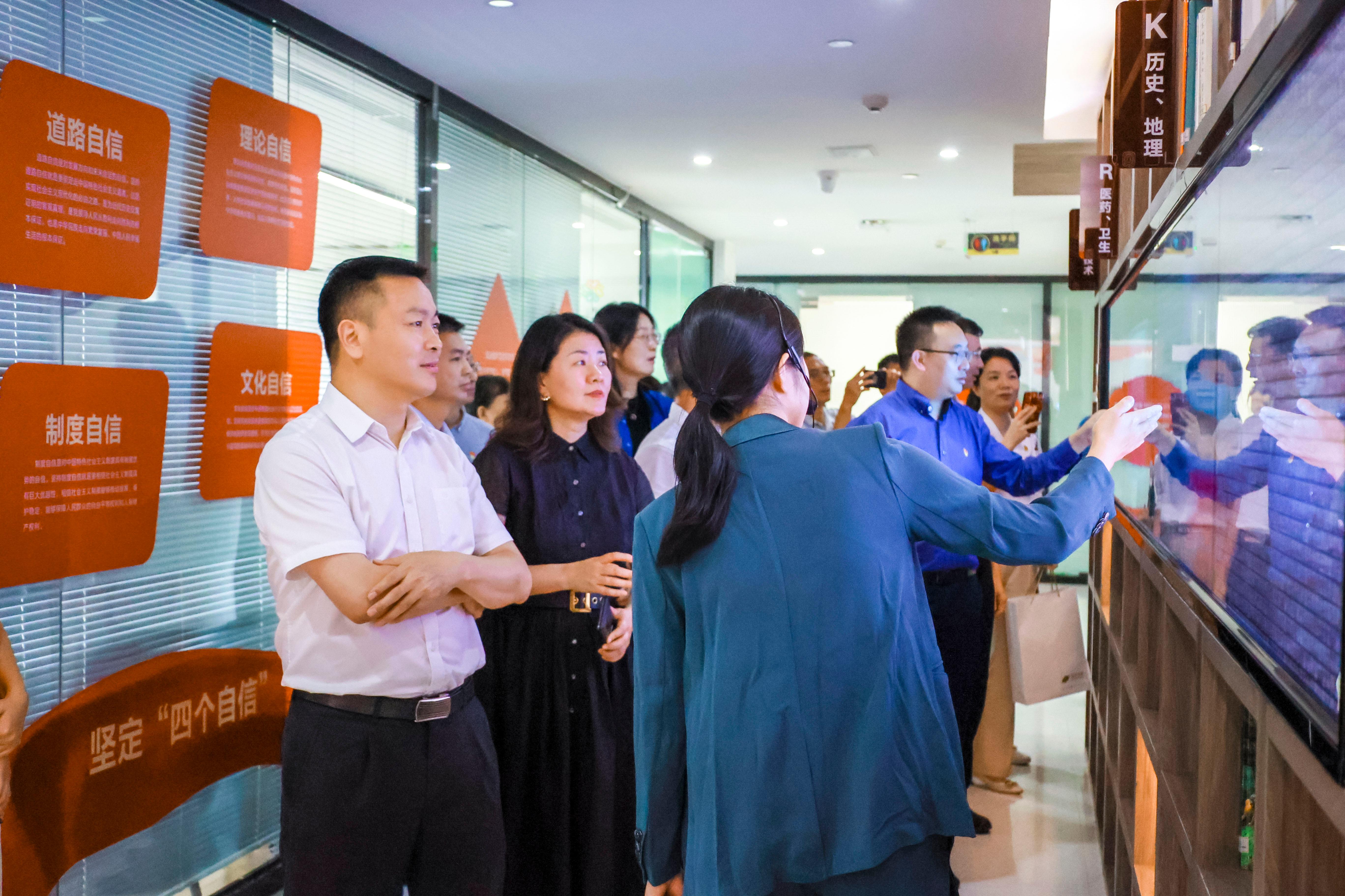 在位于深业上城的深业集团,吴报水一行参观深业上城元宇宙体验党群服务中心和城市云客厅。党群服务中心引进前沿科技,赋能党建文化,数字人党建服务讲解员、穿越平行时空虚拟体验、VR沉浸式体验区等一系列党建空间设施,体现“党建+科技”“党建+文化”的成效;城市云客厅聚焦党建与经营相融双促,以员工笑脸墙、深业运营智慧平台、航天育种农业技术攻坚战等成果展示,体现深业上城以高质量党建引领高质量发展的理念。随后,双方进一步展开座谈。