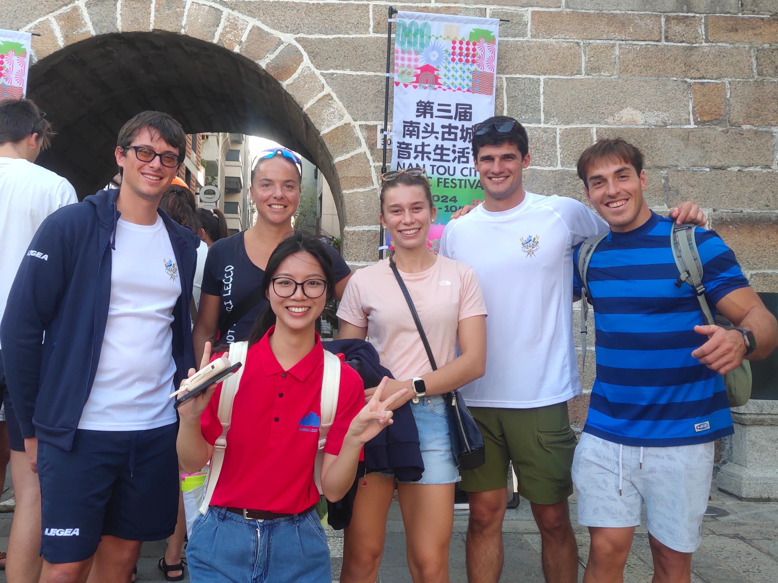2023级德语专业的刘相宜负责瑞士苏黎世艾伦巴赫赛艇俱乐部代表队的随队服务。尽管做了充分的准备,但一开始瑞士队员习惯英语、法语、德语混合的表达方式还是令她感到“头炸”。不过很快,她就适应了多语种“无缝切换”。曾两次参赛奥运会的队员Martino Goretti为她竖起大拇指:“相宜为我们带来了非常贴心的服务和帮助,通过和她交流,我们也进一步感悟到了中国文化的魅力。”几天的用心服务和真诚交流,让刘相宜和队员们结下了深厚的友谊,队员们带她体验划赛艇,向她赠送俱乐部队服,在她胳膊上贴队徽纹身贴,“他们说,这代表我是俱乐部的‘自己人’。”刘相宜也向队员们赠送了中国的窑变茶杯,以“一杯子,一辈子”的谐音寓意友谊长存。临别,她还用双语为队员们写了明信片:“这美好的记忆将永存在我的脑海。”
