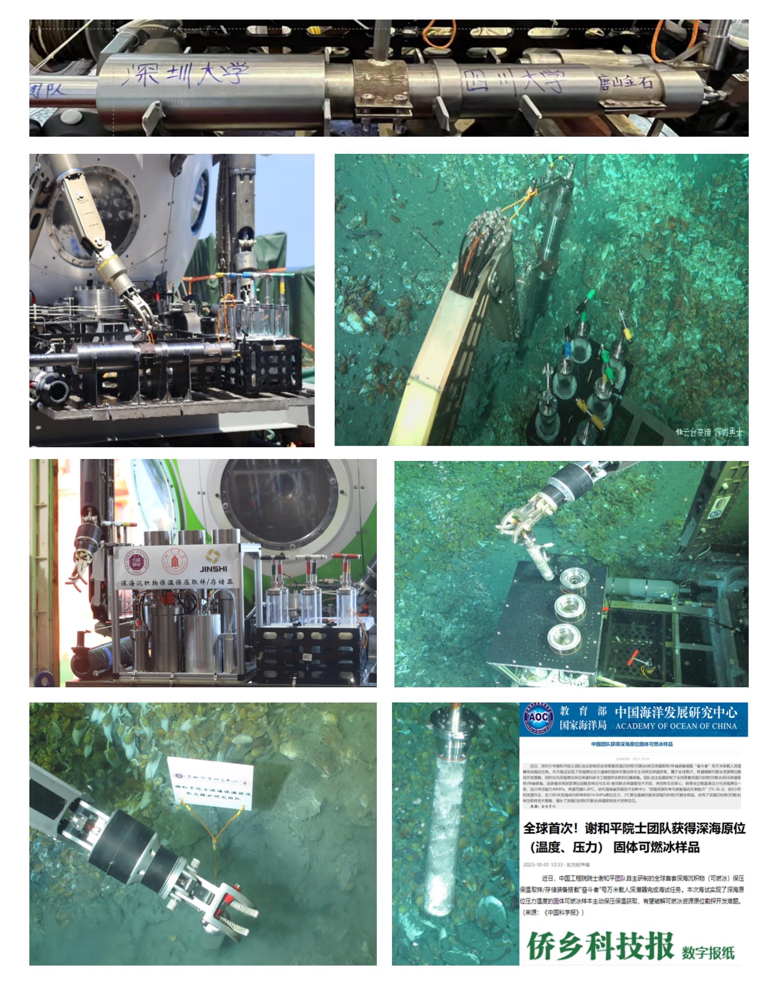 针对深海可燃冰/沉积物原位保压保温取芯存储与样品物理力学参数保真测试的国际难题,谢和平院士团队创新研制了深海可燃冰/沉积物保压保温取芯存储与测试关键技术及装备,自主研制了全球首套基于深潜器与钻井平台的深海保压保温取芯与存储技术装备,实现了深海原位压力温度的固体可燃冰样本主动保压保温获取全球零的突破。2022年9月23日,搭载探索二号科考船4500米级“深海勇士”号深潜器,在南海海马冷泉1370米水深区域完成多点位保压保温取样作业,在国际上首次获得保持原位压力13.8MPa、温度6.51℃的深海可燃冰样品。2023年9月27日,搭载探索一号科考船万米级“奋斗者”号深潜器,在我国南海海马冷泉1385m水深区域,首次获取了保持14.5MPa原位压力、3℃原位温度的固体深海沉积物/可燃冰样品。中央电视台、中国科学报、科学网、香港商报等多家媒体报道了这一重大成果。同时,应用该技术发现了深海可燃冰/沉积物中微生物的新种及基因资源,为探索深海生命新奥秘提供新认识!