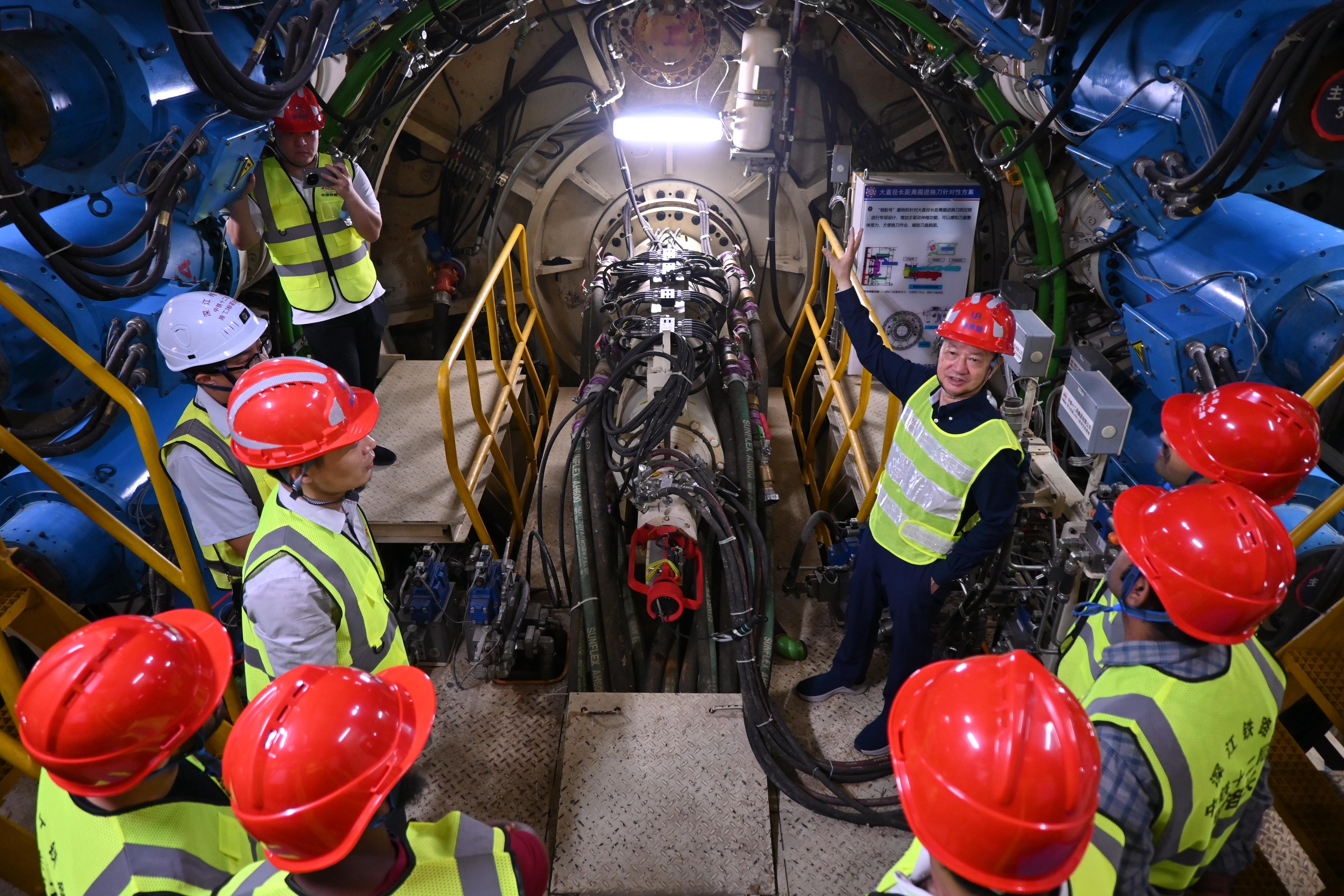 在中铁十二局集团深江铁路项目部,同学们走进直径达12.85米的“领航号”盾构机,零距离学习掘进工艺与管片拼装流程。