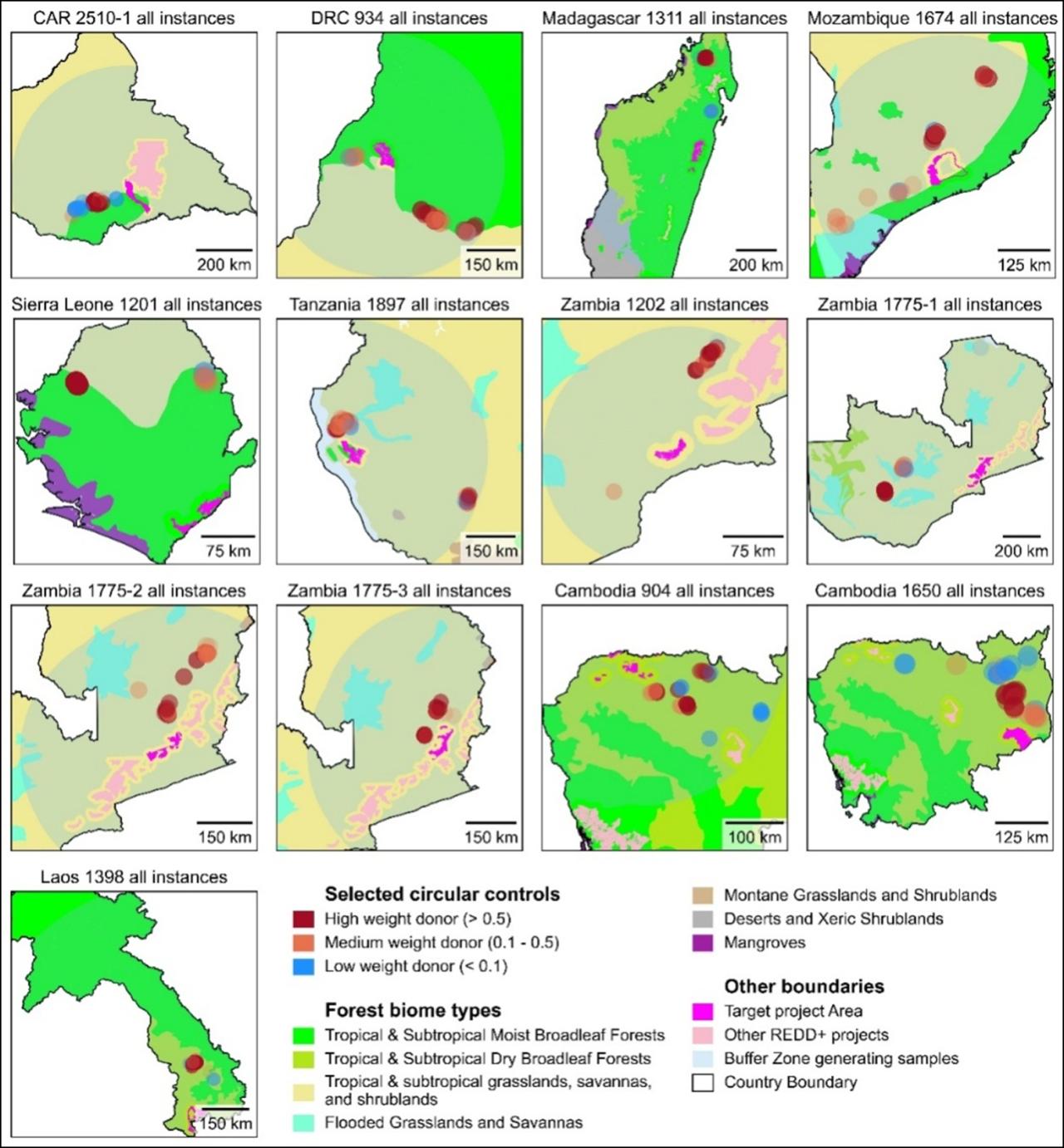 面对这一挑战,李清泉院士带领乐竞平台和光明实验室团队开展攻关研究,评估了迄今为止最大规模的自愿REDD+项目的真实气候效益(涵盖12个热带国家共计52个自愿REDD+项目(66个项目单元))(图1)。团队基于多种合成控制法、多源遥感地理大数据和多轮随机实验,综合考虑各类时变毁林风险因子和时空特征匹配算法,发展了一套透明可靠的自愿性REDD+项目动态基线构建方法,实现了项目和区域尺度上的REDD+项目的气候效益的准确量化。该方法通过在项目区周边不受保护的地带,严格匹配与项目区实施REDD+前地理空间特征和历史森林砍伐动态一致的地块得到基线参考区(控制区)(图2),基线参考区的森林变化动态可认为是项目区未实施REDD+的基线情景。该方法生成的动态基线能够融合外部环境变化,有效克服传统静态基线无法反映毁林驱动因子动态变化的缺陷。同时,基线毁林面积可通过卫星影像监测得到,使计算更透明、验证更便捷,且不易被人为干预。