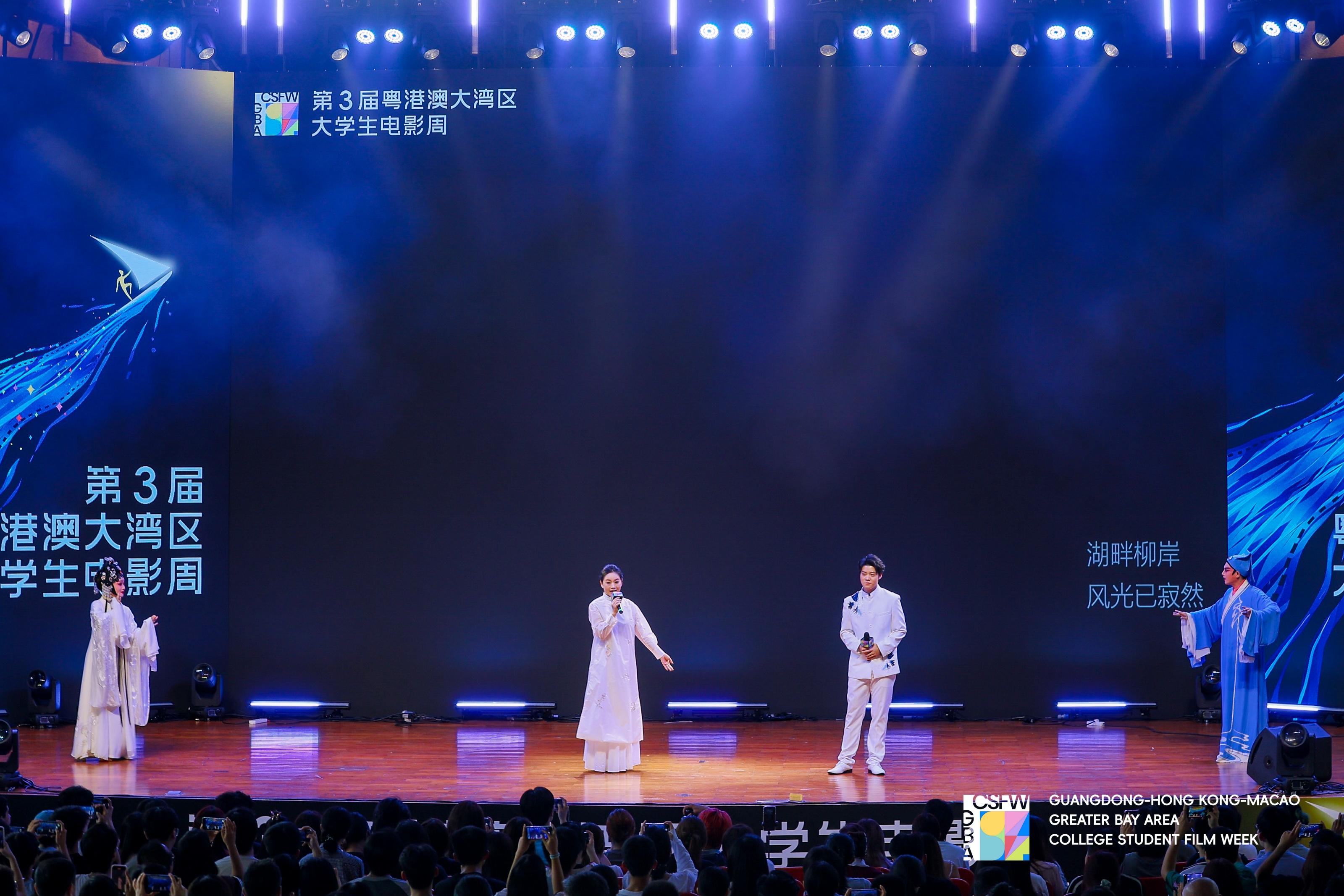 当天下午,著名演员、电影周艺术顾问张颂文为青年电影人送上真挚寄语,鼓励大家勇敢追梦,用镜头记录时代,用光影传递青春力量。著名粤剧演员曾小敏与暨南大学澳门籍学生李洋乐一同演唱粤剧电影《白蛇传·情》推广曲《待你归来》,广东粤剧院一级演员杨静、玉龙倾情伴舞。传统戏曲与现代影视跨界融合,展现“一曲千般情,万象入戏来”的艺术魅力。