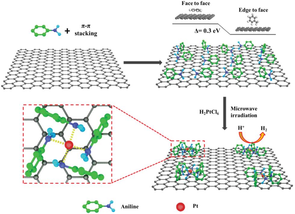 氢能作为一种重要的清洁能源,具有高能量密度、可再生和清洁无污染的优点,在未来绿色新能源开发中占据着极其重要的地位。随着电能的普及和成本的下降,电解水制氢成为未来最有效的制氢方法。因此,开发高效的HER电催化剂是电解水制氢大规模工业化应用的关键。该研究团队开发了一种新颖简便的苯胺锚定和微波还原法在石墨烯上负载铂单原子(Pt SASs/AG)用作析氢催化剂。该方法简单易行、制备条件温和,制备过程中无需进行高温处理,并且不论贵金属前驱体用量多少,均能专一地形成单原子位点分散在石墨烯表面。同时该方法还利用了石墨烯优异的导电性能,很好地解决了单原子催化剂应用于电催化体系的技术瓶颈。研究发现,Pt SASs/AG具有优异的HER活性,在电流密度为10mA cm-2时过电势η= 12mV,在η= 50mV时质量电流密度为22400 A g-1Pt,比市售20wt% Pt/C高46倍。 此外,Pt SASs/AG催化剂比Pt/C具有更为优异的稳定性。密度泛函理论(DFT)计算表明原子级分散的Pt位点与苯胺上的N结合优化了Pt的电子结构和氢吸附能,使得Pt单原子表现出优异的HER催化活性。该研究为单原子催化剂的制备和应用研究提供了全新的思路。
