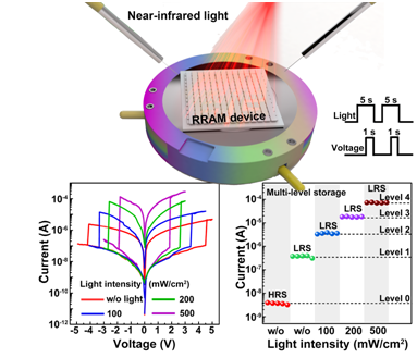 结构简化,功能化和多样化是后摩尔时代电子存储技术发展的主要趋势。光电阻变存储器因为其结构简单,易于集成和存储密度高等优点,成为当前研究热点。然而当前研究主要集中在利用紫外光或可见光来调控光电存储器。与紫外光或可见光相比,近红外光具有较大的生物穿透深度且对组织无损伤,在植入式和可穿戴柔性电子设备中具有更光明更广阔的应用前景,然而因为其光子能量较小,无法激发大多数半导体材料。因此如何利用近红外光调控阻变存储器并进而实现多比特存储是一个迫切需要解决的科学问题。针对上述技术问题和挑战,该课题组巧妙设计了二硫化钼和上转换纳米颗粒的复合材料(MoS2–Upconversion-Nanoparticle),并将这种材料应用于阻变存储器中。由于上转换材料可以吸收近红外光然后发射可见光,而发射出的近红外光可以再次激发二硫化钼产生激子;同时产生的激子可以在二硫化钼/上转换颗粒异质结界面分离成电子和空穴改变材料导电能力。通过改变近红外光光照强度,阻变存储器电阻态会相应改变,表现出多级存储特征,提高了存储器存储密度。本实验不仅填补了利用近红外光调控阻变存储器的空白,而且可以将其应用于电子眼等设备中,为下一代高性能光电存储器及光电器件的开发和集成提供了新思路。