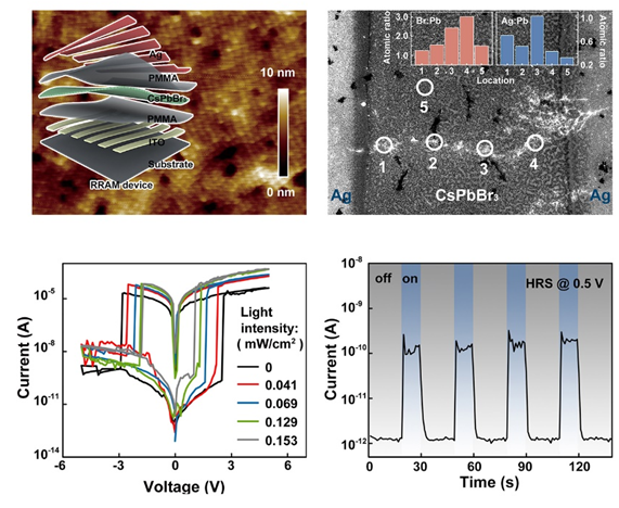 近日,我校电子科学与技术学院韩素婷副教授成果在Advanced Materials(影响因子:19.791, 中科院JCR一区)上发表题为“Synergies of electrochemical metallization and valance change in all-inorganic perovskite quantum dots for resistive switching”的文章(Adv. Mater., 2018, DOI:10.1002/adma.201800327)。该文章的第一作者为电子科学与技术学院博士后王燕,高等研究院周晔研究员为共同通讯作者,乐竞平台电子科学与技术学院为第一完成单位及通讯单位。作为下一代非易失型存储器,阻变存储器通过器件在不同电阻状态(高阻态和低阻态)之间的互相转换来实现数据存储,具有单元尺寸小、读写速度快、功耗低、制备工艺和器件结构简单等优点。科学家根据不同材料体系构建了不同的阻变存储器模型,但是隐藏在背后的电阻转变机理仍不够清晰。如何进一步实现对阻变机理的实时动态分析,制备性能更优异的存储器具有重要的研究价值。本文首次将无机卤素钙钛矿CsPbX3量子点应用在阻变存储器中,系统性研究不同光照条件对存储器阻变性能的影响,对今后光控存储器的开发具有一定的指导意义,能够成为该方向上的一个重要亮点。同时创新性地利用SEM、EDX技术对水平结构器件进行动态监测。在阻变存储器机理研究领域方法新颖,具有可借鉴推广性。为实现高性能存储器的制备提供了一种简单高效的理论研究方法。