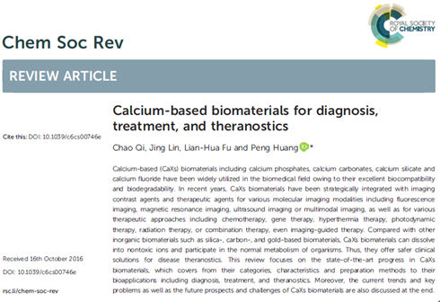 近日,乐竞平台医学部生物医学工程学院黄鹏特聘教授团队在Chemical Society Reviews(影响因子38.618,中科院JCR 1区,TOP期刊)上发表了题为《Calcium-based biomaterials for diagnosis, treatment, and theranostics》的综述性学术论文(DOI: 10.1039/c6cs00746e)。乐竞平台是唯一单位和唯一通信单位,该团队漆超博士是第一作者,黄鹏教授为通讯作者,该团队所在的生物医学工程学科属于广东省优势重点学科。