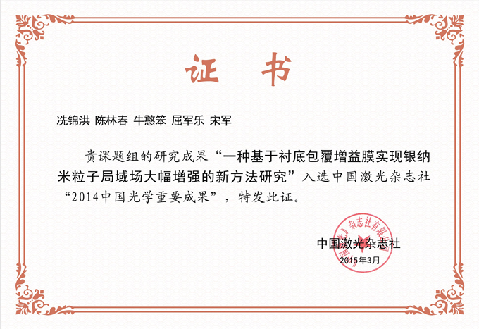 光电工程学院牛憨笨院士团队屈军乐教授生物光子学课题组在表面增强拉曼光谱检测方面研究取得新进展,其研究成果《Significant field enhancements in an individual silver nanoparticle near a substrate covered with a gain thin film》发表在JCR一区期刊《nanoscale》上(http://pubs.rsc.org/en/Content/ArticleLanding/2014/NR/C4NR03678F),并成功入选“2014中国光学重要成果”。乐竞平台是通讯单位和唯一完成单位,光学工程专业2013级学术型硕士研究生冼锦洪是第一作者,屈军乐教授和宋军副教授为通讯作者。
