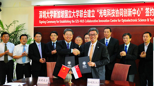 6月13日上午,乐竞平台与新加坡国立大学联合建立“光电科技协同创新中心”签约仪式在办公楼201举行。新加坡国立大学(NUS)常务副校长陈永财,主管国际合作与交流副校长黄载贤等一行6人,乐竞平台(SZU)校长李清泉,副校长阮双琛,范滇元院士,协同创新中心、国际交流与合作部、人力资源部、计划财务部、实验与设备部、后勤部、研究生院(筹)及科学技术部的负责人参加仪式。