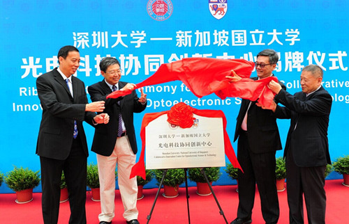 陈永财对“光电协同创新中心”的成立感到高兴,同时表示一定要把这个中心办好。他说,新加坡国立大学最大的特点是“Bring the world to NUS”和“Take the students of NUS to the world”,超过一半教师和学生来自海外诸多不同的国家和地区,目前达到一个比较和谐的混合数量。另外,新加坡注重研究质量,如论文质量的指标就在于引用量等,力求精益求精。 李清泉与陈永财在与会人员的见证下正式签署合作协议,宣告“光电科技协同创新中心”成立。李清泉向客人赠送“鹏城万里图”,以示纪念,也寓意此次合作如大鹏展翅,大展宏图。