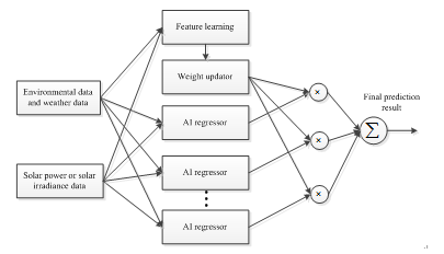 太阳能发电预测是电力能源系统经济、安全运行的重要环节。本文首先对人工智能预测方法、参数优化和预测结构展开了分类、命名和统计分析研究,总结了各种预测方法的优缺点。其次,本文提出了一种新的人工智能预测结构。该预测结构分为特征学习、权重更新和多元回归三个部分,如图1所示。特征学习用于提取环境数据和时序数据的潜在特征,并作为权重更新的输入。权重更新则用于优化多元回归的权重系数。多元回归负责太阳能发电预测输入和输出的数学建模。该预测结构最大的优点是其强大的兼容性,可兼容已有的大部分神经网络算法,如支持向量机、深度学习和循环神经网络等。最后,本文对太阳能发电预测的热点方向和潜在问题进行了深入剖析。