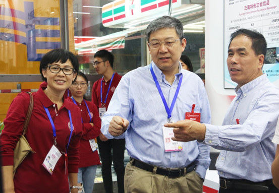 李校长逐一观摩我校参展的项目成果,文振焜主任详细地介绍了我校本届高交会的参展情况,各项目负责人就每个项目进行了详尽的介绍与演示。在观摩过程中,李校长对面向智慧城市的智能视频数据分析系统、改善代谢功能饮品、含干细胞因子的可降解吸收修复面膜、荔康云智能饮食健康平台、荔康智能体检站、排线与排线连接器壳体自动接插机以及全自动样品转移系统等若干项目表现出浓厚的兴趣,并与项目负责人面对面交谈,仔细询问了项目的研究现状、市场前景及创新点。