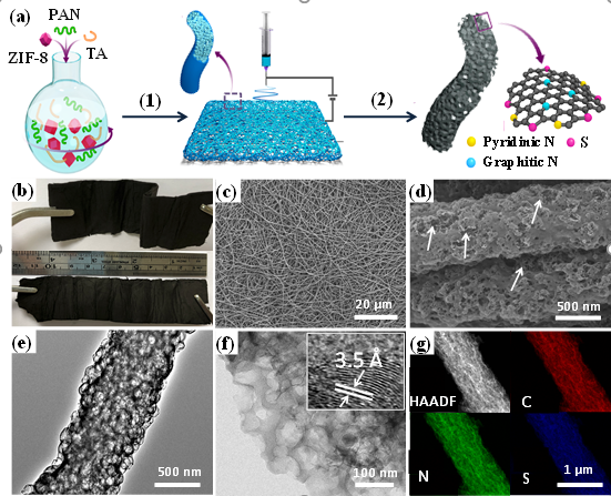 化学与环境工程学院何传新课题组在电催化二氧化碳转化方面取得重要进展, 研究成果以“Composition Tailoring via N & S Co-doping and structure Tuning by Constructing Hierarchical Pores Enable Metal-free Catalysts for High-Performance Electrochemical Reduction of CO2”为题发表在化学权威期刊《Angew. Chem. Int. Ed》(JCR 一区,影响因子12.102)上。CO2是最主要的温室气体之一,同时也是一种廉价无毒、来源广泛的C1资源。使用电化学方法还原CO2(CO2RR),不但具有环保价值,还可以获得具有一定经济价值的化学产品,因而受到越来越多的关注。此项工作报道了一种简易制备系列氮硫共掺杂的,具有微孔大孔等多级孔结构的碳纳米纤维(NSHCF)薄膜。该薄膜具有良好的导电性以及柔韧性,可直接作为阴极,用于电化学CO2还原反应。在相对低的过电势可以获得94%法拉第效率的CO,同时其电流密度可以达到-103 mA cm-2,这是目前无金属CO2RR催化剂报道的最佳结果。课题组杨恒攀博士是论文的第一作者,乐竞平台何传新副教授和佐治亚理工的林志群教授为论文的共同通讯作者,乐竞平台为第一完成单位和通讯单位。
