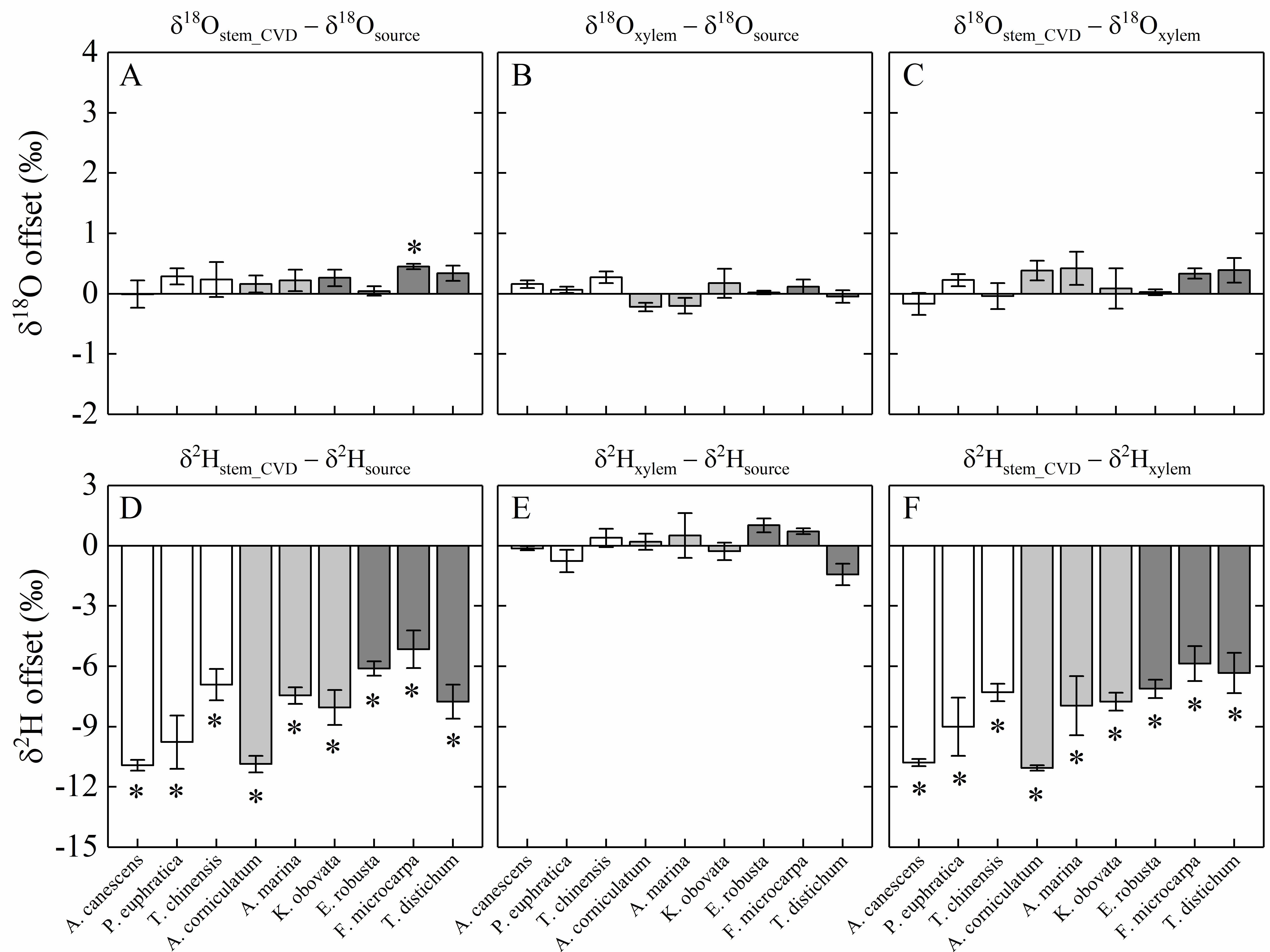 图2不同生境来源木本植物茎干样品低温真空抽提水(stem_CVD)、土壤水(source)和蒸腾水汽(xylem)氢氧同位素值的比较