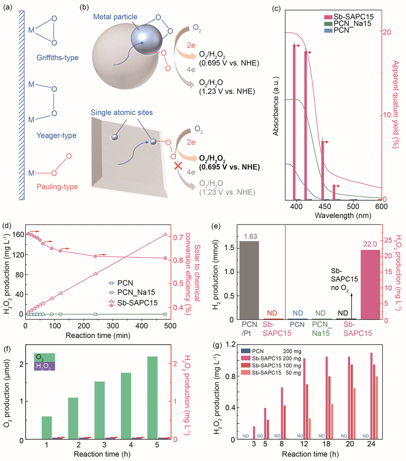 1.开发了一种Sb单原子光催化剂(Sb-SAPC),用于可见光照射下水和氧气混合物中通过光催化合成H2O2。