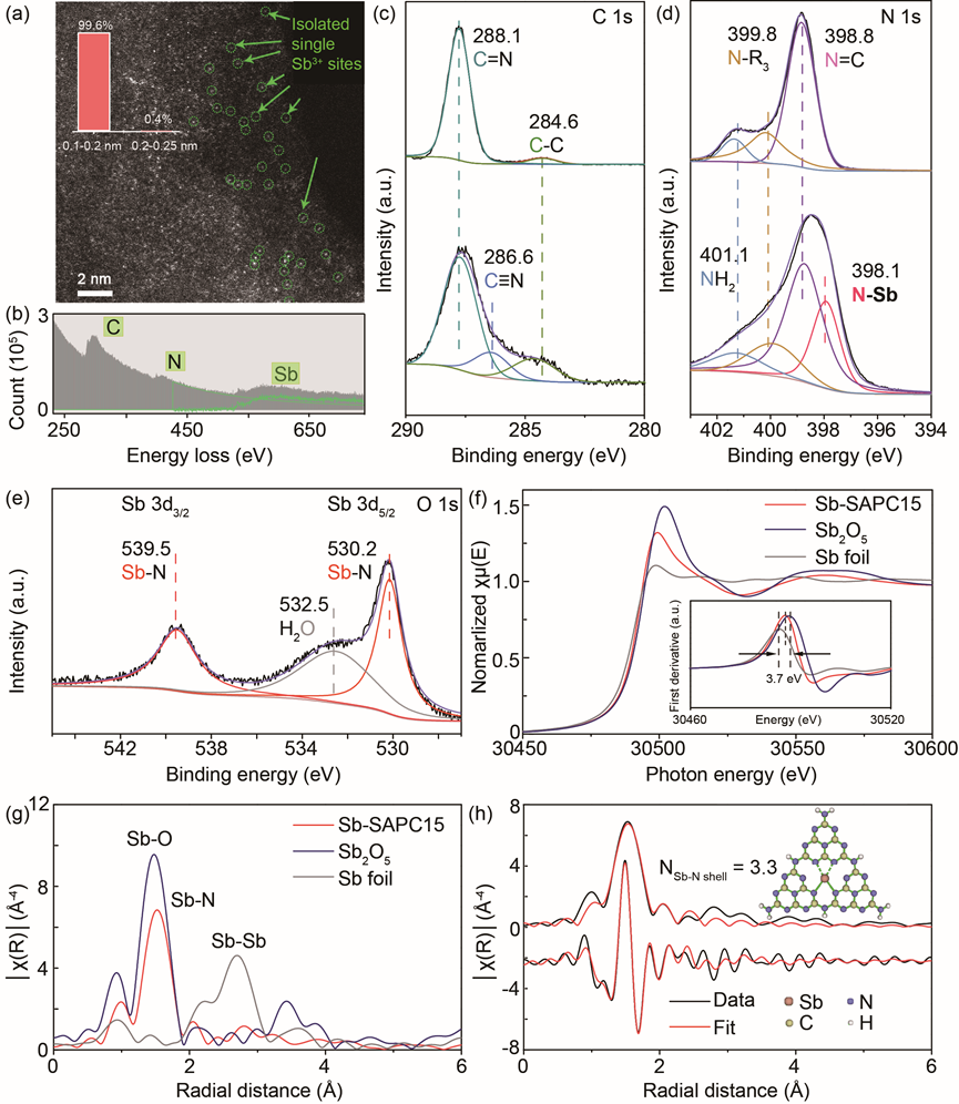 Sb-SAPC15的高分辨扫描透射高角度环形暗场像中亮点的大小部分均小于0.2 nm。Sb-SAPC15的电子损失谱说明该区域由C, N, Sb构成,也表明Sb元素存在于PCN的结构中 (图 4a-b)。 图4c-e, PCN的高分辨率C 1s(c)和N 1s 光电子能谱光谱(d)和Sb-SAPC15的Sb 3d XPS光谱说明,Sb可能与N原子成键,且化合价接近+3 (图4c-e)。Sb箔, Sb2O5和Sb-SAPC15的Sb-K边 X射线近边吸收谱和精细结构谱表明XANES和傅立叶变换扩展X射线吸收精细结构(FT-EXAFS)光谱(图4 f-h)进一步说明了Sb的价态接近+3。从DFT优化获得的模型拟合Sb-SAPC15的EXAFS数据说明,Sb与周围N原子的平均配位数为3.3。