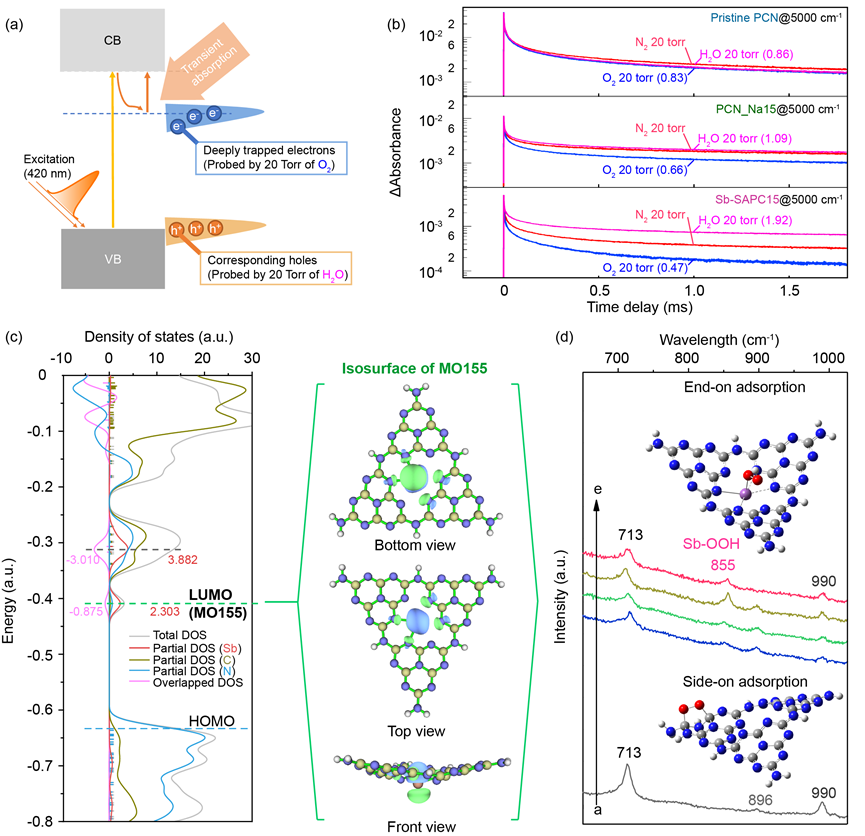 作者进一步用不同气氛下的瞬态吸收谱作为OER / ORR的探针(图5a-b)。在N2, O2和H2O气氛(20 Torr)下, 5000 cm-1波长的脉冲光激发下PCN, PCN_Na15和Sb-SAPC15之间的瞬态吸收衰减的比较说明,Sb-SAPC15所生成的电子和空穴可以分别高效地与氧气和水反应。Melem_3Sb3+的总态密度(TDOS), 分状态密度(PDOS)和状态重叠密度(ODOS)与LUMO等值面(Isovalue为0.05) 表明,电子在光激发的时候主要被累积到Sb原子上,利于氧还原反应(图5c)。通过原位拉曼光谱的数据表明(图5d), O2分子在孤立的Sb原子位点的吸附是端对端吸附(end-on), 这选择性促进了Sb-μ-过氧化物(Sb-OOH)的形成,避免了以往利用氮化碳材料在melem位点处形成的侧面(side-on)吸附态, 从而减少了氧氧键的断裂,为H2O2的生产提供了高选择性的2e- ORR途径。