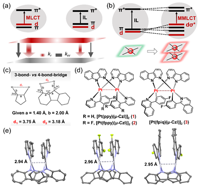 Figure 1.(a) Illustration of the orbital diagrams and decay dynamics (krandknr) of3MLCT and3IL excited states. (b) The formation and orbital diagrams of MMLCT excited states for square-planar Pt(II) complexes. (c) Trigonometry analysis of the intermetallic distance dependent on the bridging ligand. (d) Chemical structures and (e) perspective view of the single crystal structures of the dinuclear Pt(II) complexes1−3in this work.