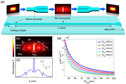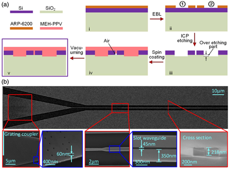 器件的工艺流程及SEM图如图2所示。最终制备的器件狭缝宽度为45nm,狭缝深度218nm,硅波导宽度为350nm,MEH-PPV厚度250nm。