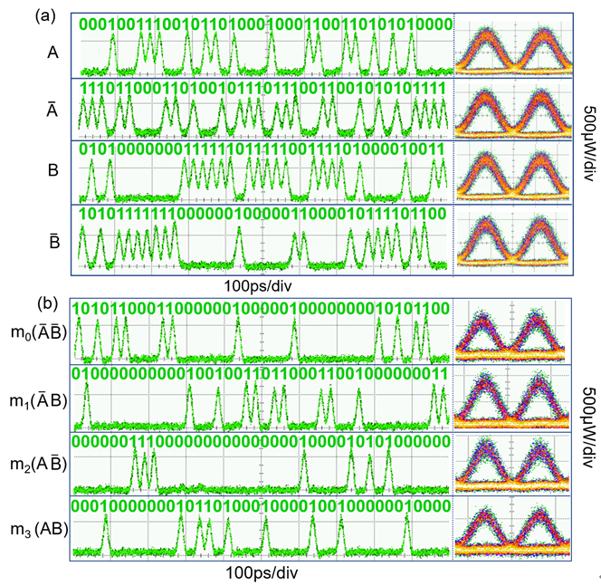 全光逻辑是全光信号处理中的基础性技术,也是关键技术之一。在光网络的各个层,都会涉及到与光逻辑有关的信号处理。如全光复用/解复用/分插复用、码型转换、波长转换、2R再生(再整形、再定时)、全光判决、数据包交换、光标签、包头提取、包头识别、全光采样等。此外,全光逻辑也是实现全光计算的重要方法。全光计算技术采用光学方法实现对光数据信息的运算处理,具有并行处理、高速度、大容量、空间传输和抗电磁干扰等优点。基于该高非线性硅基聚合物狭缝波导中的四波混频效应,团队实现了速率为40Gb/s的高速两输入全光标准逻辑单元运算。实验方案如图5所示。图6展示的逻辑结果码流正确、眼图清晰张开,所有逻辑运算结果均达到无误码状态。该高非线性硅基聚合物狭缝波导在未来超快片上全光信号处理中将具有重要的应用前景。