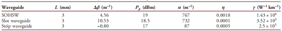 该工作比较了3mm长度下,提出的高非线性硅基聚合物狭缝波导、未填充聚合物的狭缝波导以及普通条形波导(220nm×450nm)的非线性系数。非线性系数测试及计算通过两束连续光的简并四波混频实现。实验方案及测试结果如图3所示,从结果可以看出,该工作提出的高非线性硅基聚合物狭缝波导的四波混频转换效率,相对于未填充聚合物的狭缝波导以及普通条形波导,分别提高了12dB和5dB以上。由四波混频转换效率计算得出,高非线性硅基聚合物狭缝波导的非线性系数可达1.43×1061/W/km,是未填充MEH-PPV时非线性系数的4倍,是普通条形波导的近6倍。
