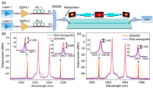 图3 高非线性硅基聚合物狭缝波导四波混频实验及实验结果