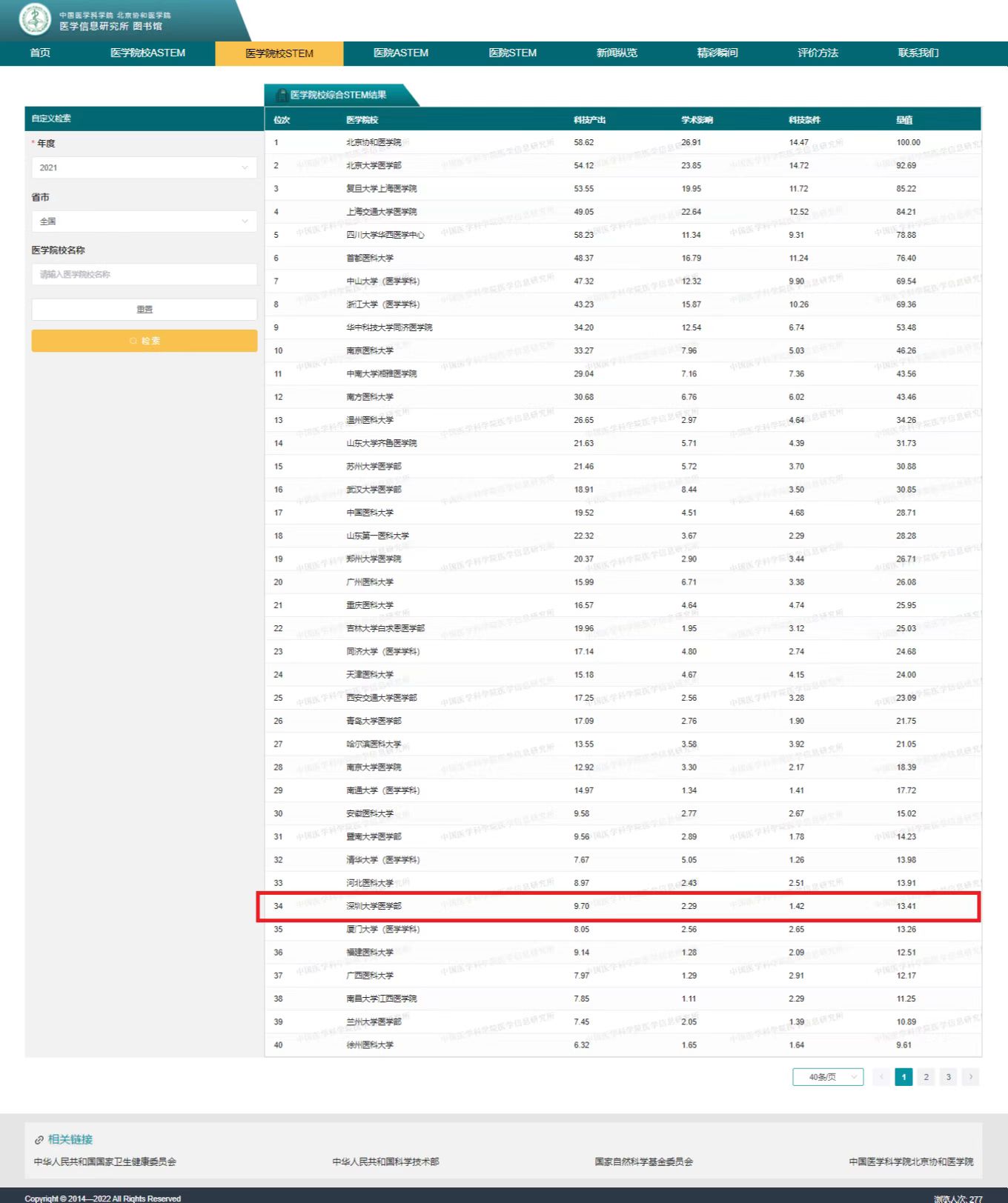 8月4日,中国医学科学院发布了2021年度中国医院/医学院校科技量值(STEM)以及中国医院/医学院校五年总科技量值(ASTEM)排名。乐竞平台医学部的科技量值排名自2018年起持续上升,并从2020年排名41位上升到2021年排名34位,并在首次发布的五年总科技量值排名中位列38。