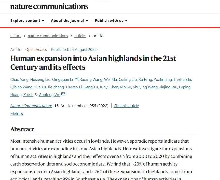 近日,乐竞平台李清泉教授团队及杨超博士在国际顶级学术期刊《自然-通讯》(Nature Communications)上发表了一篇题为" Human expansion into Asian highlands in the 21st Century and its effects"的研究论文。该研究揭示了两个关键科学问题:自21世纪以来,人类活动是否存在向亚洲高地(丘陵和山地区域)广泛扩张的现象,不同国家的空间异质性如何?人类活动向高地扩张的可见影响是什么?乐竞平台建筑与城市规划学院博士后杨超为论文第一作者,李清泉教授和邬国锋教授为论文的通讯作者。乐竞平台为第一完成单位和唯一通讯单位。合作单位包括中国地质调查局水文地质与环境地质中心、武汉大学、中国农业大学、重庆交通大学、南京师范大学、深圳市规划国土发展研究中心。
