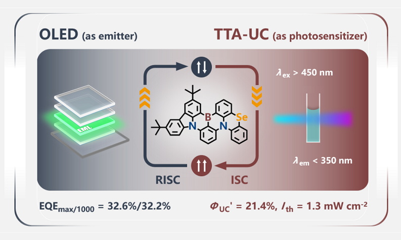 近日,乐竞平台杨楚罗教授和曹啸松助理教授团队合理设计了一种具有刚性结构的新型含硒MR-TADF化合物BN-Se,利用硒元素的重原子效应,在不影响辐射跃迁速率的前提下极大增强了单三重态间的自旋轨道耦合,进而促进了ISC及RISC过程。该材料罕见地同时表现出了高摩尔消光系数(ε = 2.6 × 104 M−1 cm−1)、窄谱带发射(FWHM = 42 nm)、高光致发光量子产率(ΦPL = 99%)、高辐射跃迁速率(kr = 1.4×108 s-1)、高ISC效率(ΦISC = 88%)以及高RISC速率(kRISC = 1.6×106 s-1)。作为发光客体,其优异的发光性能和平衡的激子动力学过程使得BN-Se在OLED器件中不仅实现了高外量子效率(32.6%),效率滚降也得到了有效抑制(1000 cd m-2时衰减仅为1%)。作为光敏剂单元,利用其高效的ISC过程和极低的固有能量损失,首次实现了蓝光(>450 nm)到紫外(<350 nm)的上转换过程,相应上转换量子产率高达21.4%,阈值强度低至1.3 mW cm−2,是已报道可见-紫外TTA-UC体系的最佳性能之一。