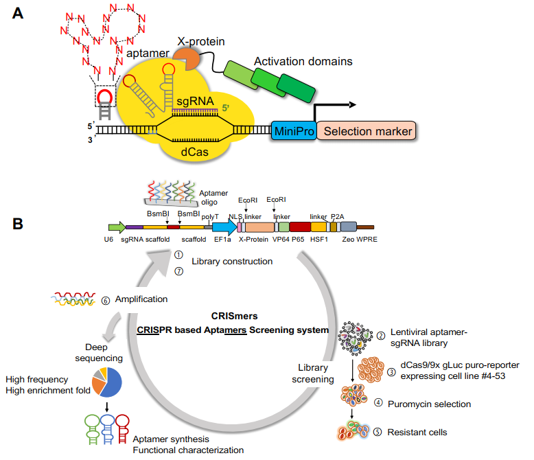 首先,该团队设想了CRISmers的概念,然后应用GFP和此前经SELEX筛选获得的RNA适配体进行了初步的概念验证和筛选系统的关键参数指征,从而得到了CRISmers筛选系统的工作流程。简单来说,将适配体随机序列文库以pooled方式构入进sgRNA骨架,若文库中含有与特定靶蛋白结合的亲和序列,即可招募与靶蛋白融合的转录激活因子,从而激活下游抗性基因的表达。通过施加抗性筛选压力,即可将携带亲和配体的细胞在体系中富集。包含RNA适配体的文库通过慢病毒递送,整合进入细胞基因组。RNA适配体的序列信息可以通过提取基因组、定向扩增配体区段、以及深度测序获取。