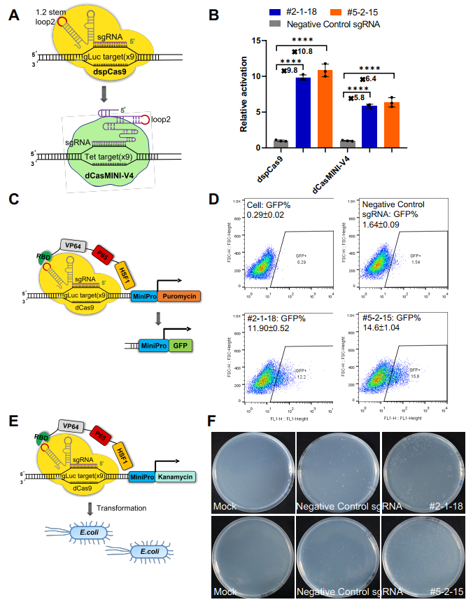 最后,该团队还对CRISmers系统的通用适配性进行了验证。应用靶向SARS-CoV-2 RBD筛选获得的两个RNA配体,对CRISmers系统中的元件分别进行了替换,包括(1)将dSpCas9替换成更小体积版本的dCasMINI-V4(2)将抗性基因替换成荧光蛋白;(3)将筛选宿主细胞由人HEK293T细胞系替换成大肠杆菌,均可捕获到RNA配体与RBD的亲和力信号。