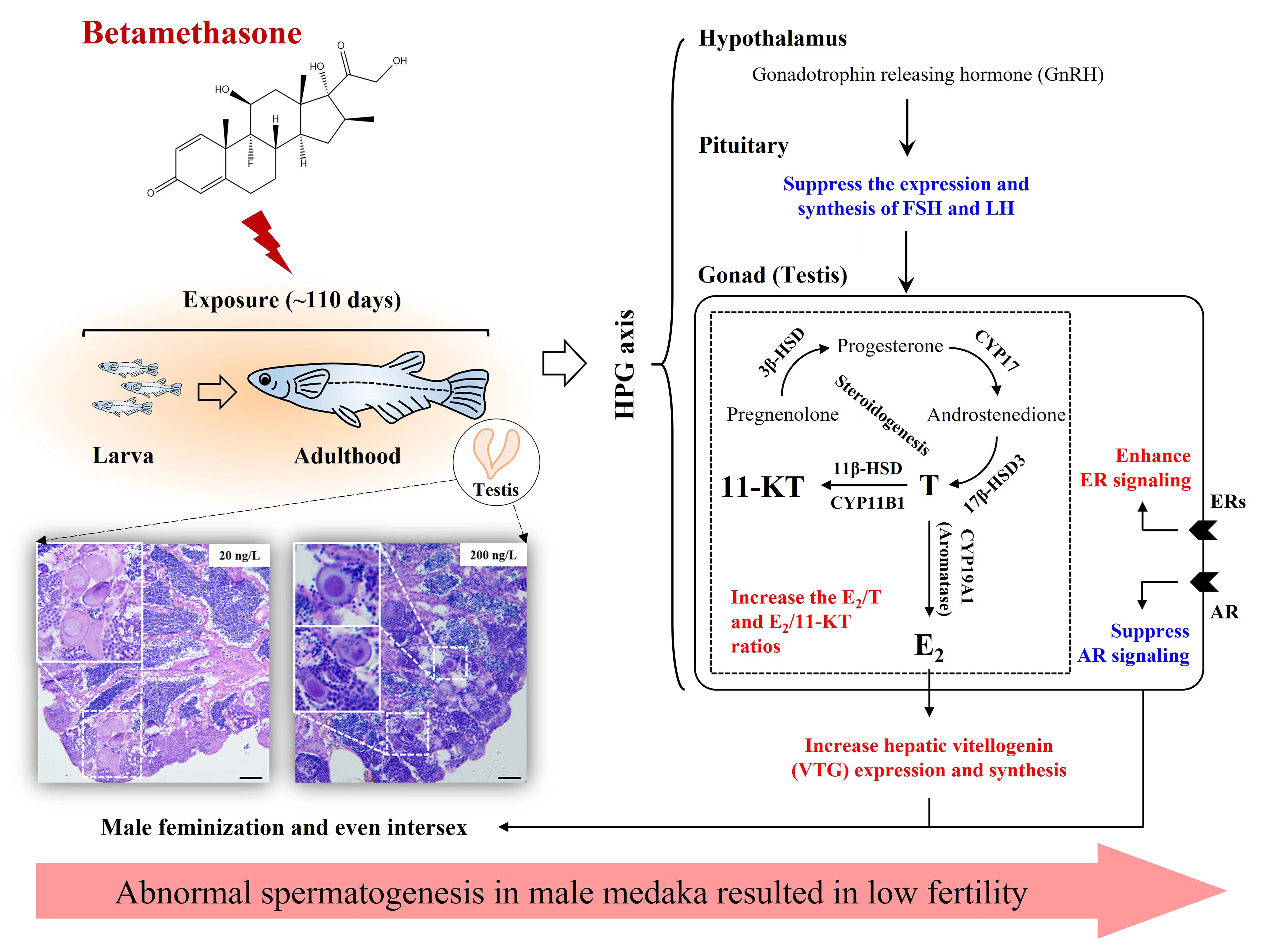 该研究以日本青鳉(Oryzias latipes)为对象,证明环境中残留的倍他米松可以干扰日本青鳉的中枢神经系统促性腺激素的合成与分泌,调节下丘脑-垂体-性腺(hypothalamus-pituitary-gonad,HPG)轴,影响性激素的合成与分泌,导致雄性个体体内雌激素比例上调,诱导雄鱼雌性化,甚至间性现象的产生,最终降低雄性个体繁殖力,此外,该研究从分子机理上阐明了倍他米松造成雄性个体生殖能力损伤的毒性效应机制。本研究的开展,首次证明了低至20 ng/L的倍他米松即可形成生殖毒性,将倍他米松的毒性效应阈值浓度降低了50倍。研究结果为进一步评估倍他米松污染导致的环境生态风险及其治理提供了数据与理论支撑。