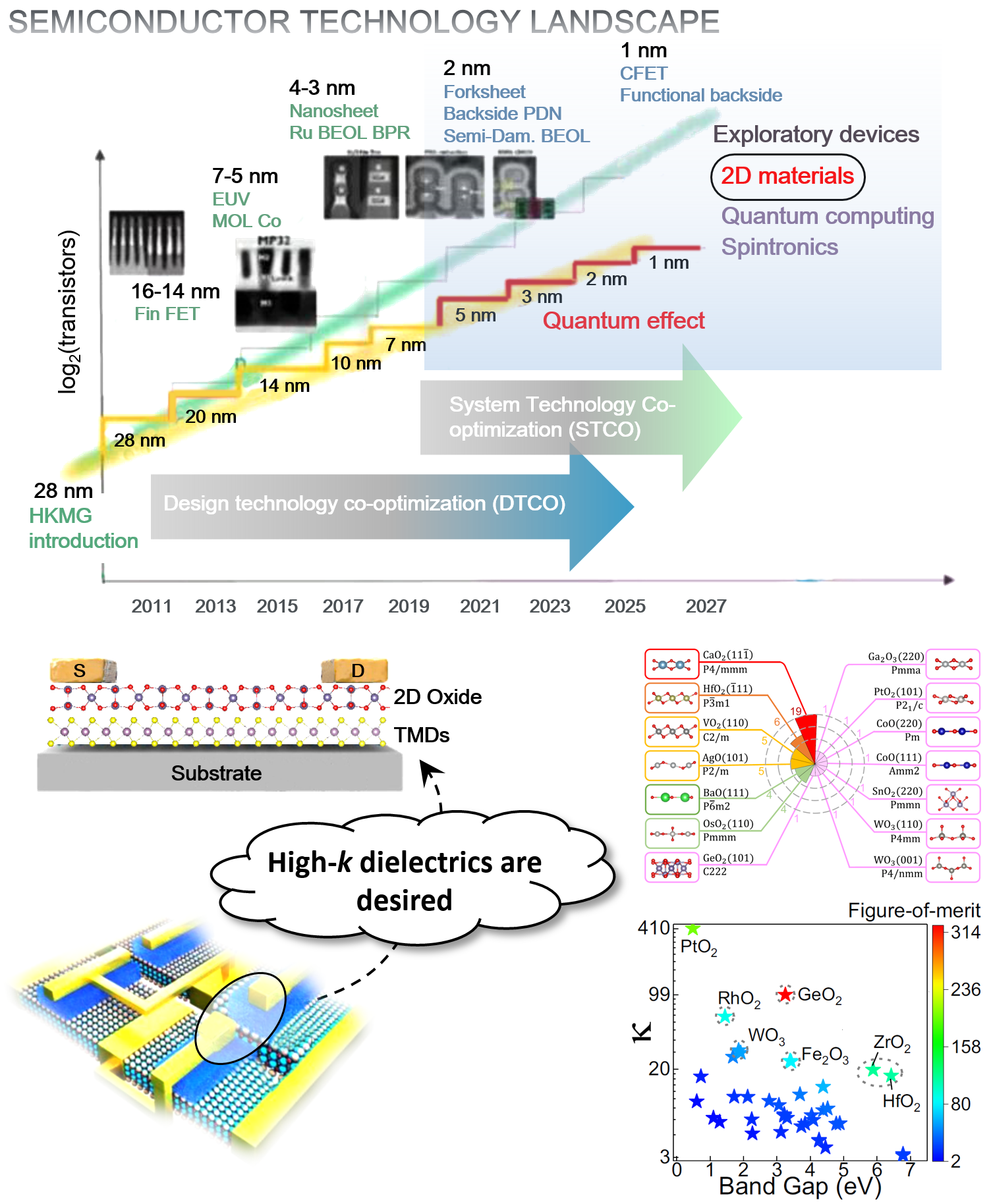 半导体集成电路正不断向高密度、大规模以及小型化的方向发展,这就要求晶体管在不断缩小尺寸的过程中性能持续增强。硅基半导体产业已延续摩尔定律的路线发展了数十年,现如今已经接近物理极限,因为当晶体管尺寸接近分子甚至原子尺度时,“瓶颈效应”愈发凸显,比如短沟道效应、功耗墙、电涌及电子击穿等问题。相较之下,二维半导体以其原子级厚度和优异的栅极调控特性,被认为是构筑“后摩尔时代”新型半导体器件与集成电路的理想材料。据国际器件和系统路线图(IRDS)预测,2028年将采用二维半导体进行芯片制造。要实现该目标,亟需解决的一个关键问题就是寻找或设计具有高介电常数(k)且与二维半导体工艺兼容的优质介电材料。
