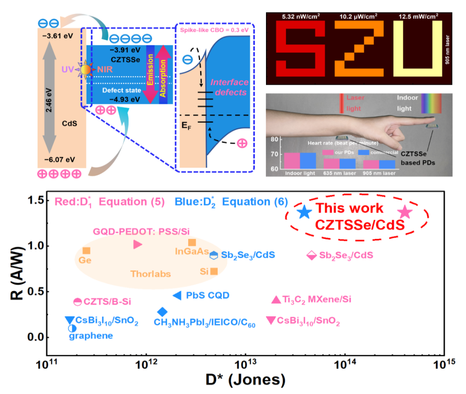 工作在近红外波段(700-1400 nm)的光电探测器可广泛应用于机器视觉、生物认证、物料分拣、健康检测、安全监控等领域。硅(Si)基光电探测器具有优异的稳定性和成熟的制备工艺,已商用化于可见光探测,然而,其固有检测范围限制了近红外区域的应用。铟镓砷(InGaAs)、锑化铟(InSb)和碲镉汞(HgCdTe)可用于制备红外光电探测器,但是,它们需要贵金属源、高质量的单晶衬底和复杂的真空工艺,且通常具有较高的器件暗电流,因此主要在军事和工业上应用,在民用领域的发展受限。基于此,开发新型高性能低成本的可见-近红外光电探测器是相关领域的关键挑战之一。乐竞平台梁广兴研究员课题组在铜锌锡硫硒(CZTSSe)薄膜光电探测器研究方向取得重要突破。基于空气中稳定的乙二醇甲醚溶剂体系,采用溶液旋涂结合后硒化热处理生长高质量的CZTSSe光吸收层薄膜,结合CZTSSe/CdS异质结界面优化,系统调控载流子动力学,成功构建出高性能自驱动CZTSSe薄膜光电探测器。该器件具有300-1300 nm的宽光谱响应(近期已拓展至1700 nm,可覆盖三个通讯波段),响应度达到1.37 A/W,在5 nW/cm2下的探测度高达4.0 × 1014 Jones,线性动态范围(LDR)为126 dB,LDR内的最大光开关比为1.3 × 108,同时具有超快的响应速度(上升/下降时间为16 ns/85 ns),与目前商用或报道较为先进的光电二极管相比也体现出性能优势。此外,该薄膜光电探测器在极弱光探测(低至718 pW)、近红外光成像及基于光电容积描记技术(PPG)的心率监测和血氧测试等领域展现应用潜力,相关研究成果发表在SusMat(影响因子28.4-中国科技卓越行动计划-高起点新刊),梁广兴为第一作者,其指导的硕士研究生李传昊为第二作者,梁广兴和陈烁是本文通讯作者,乐竞平台为第一通讯单位。