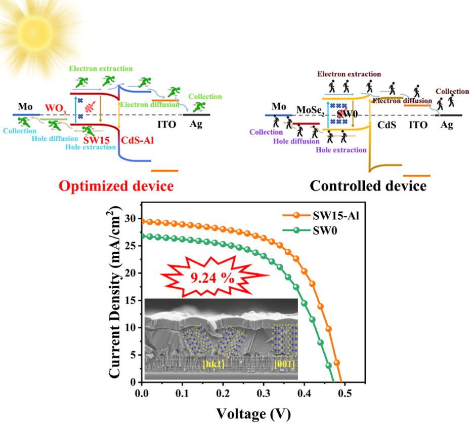近年来,硒化锑(Sb2Se3)凭借原材料绿色低毒、价格低廉、一维独特结构贡献良性晶界、二元单相组成易于制备、理想带隙匹配高吸光系数、优异的载流子迁移率及介电常数等优势,在新型高效低成本薄膜太阳电池研究领域引起广泛关注。尽管Sb2Se3薄膜太阳电池在环境友好方面具有优胜之处,但和铜铟镓硒(CIGS)薄膜太阳电池性能相比还有很大差距,整体表现为电池开路电压亏损偏高,这主要是由于光生载流子在电池内部的非辐射复合损失严重所导致的,本文深入研究埋层界面和异质结性能调控,剖析薄膜生长动力学且实现光吸收层取向可控生长,优化异质结能带匹配和裁剪背接触势垒,从而降低太阳电池的非辐射复合损失,提高光生载流子传输效率,最终获得目前已报道基于真空溅射法构建底衬Sb2Se3薄膜太阳电池的最高光电转换效率9.24%,属于国际领先水平,相关研究成果发表在Advanced Materials(影响因子29.698,中科院JCR一区,Top期刊)上,梁广兴研究员为论文通讯作者,其指导的博士研究生陈国杰为论文第一作者,乐竞平台为唯一通讯单位。