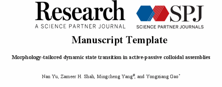 2024年1月3日,高永祥团队与中科院物理所杨明成研究员合作,在Research发表了题为 “Morphology-tailored dynamic state transition in active-passive colloidal assemblies”的研究论文。俞楠博士为论文的第一作者,高永祥研究员为论文的共同通讯作者,乐竞平台为第一单位。