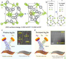 针对该难题,我院郑壮豪研究团队根据Gibbs-Wulff晶体生长定律,利用Te的掺杂引起的微应变和Se原子位置的替位掺杂降低Ag2Se(00l)平面的自由能,实现高择优生长取向Ag2Se柔性薄膜可控生长,从而调控载流子输运实现高S2σ;并利用Te掺杂所引入TeSe点缺陷、界面缺陷等多类型缺陷的作用,强化了声子散射,显著降低了薄膜热导率,最终大幅度的提高了薄膜的热电性能(ZT值~1.27,363 K);随后利用有机材料涂覆进一步优化了材料的机械性能(在6.3mm弯曲半径下1000次弯曲测试后ΔR/R0<2.5%)。在20K的温差条件下,利用所制备的N型Ag2Se薄膜和P型Sb2Te3组装的柔性热电器件的输出功率密度可达1.5 mWcm-2。该研究工作对于高质量柔性热电薄膜材料及器件的研发提供了一种极有效的全新策略和技术途径。