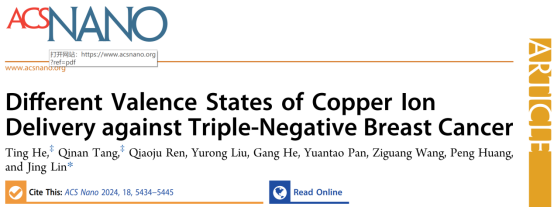 近日,乐竞平台医学部生物医学工程学院林静特聘教授团队在国际顶级学术期刊《ACS Nano》(影响因子17.1,中科院一区,TOP期刊)上发表了题为《Different Valence States of Copper Ion Delivery against Triple-Negative Breast Cancer》的研究论文。医学部助理教授贺婷、硕士研究生唐祁南为第一作者,林静教授为通讯作者,乐竞平台为唯一完成单位,该团队所在的生物医学工程学科属于广东省优势重点学科。